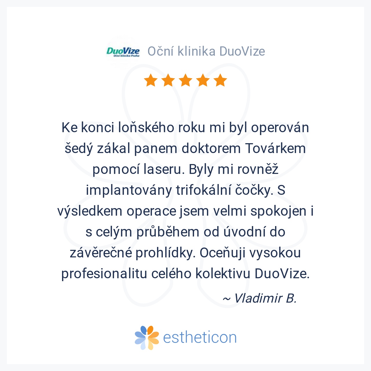 V lednu 2017 jsem byla operována panem doktorem Továrkem. Jsem spokojená s výsledky operace. Tímto děkuji panu doktorovi a jeho operačnímu týmu. Vyjadřuji plnou spokojenost i se všemi zaměstnanci kliniky DuoVize, se kter... Více