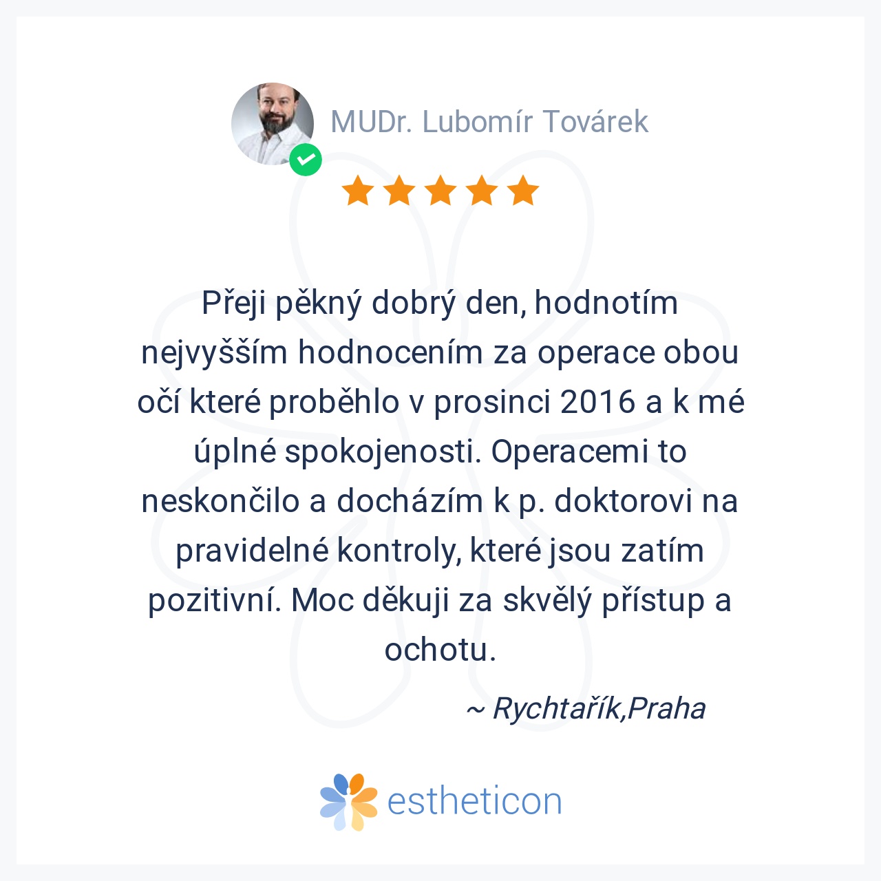 Přeji pěkný dobrý den, hodnotím nejvyšším hodnocením za operace obou očí které proběhlo v prosinci 2016 a k mé úplné spokojenosti. Operacemi to neskončilo a docházím k p. doktorovi na pravidelné kontroly, které jsou zatí... Více