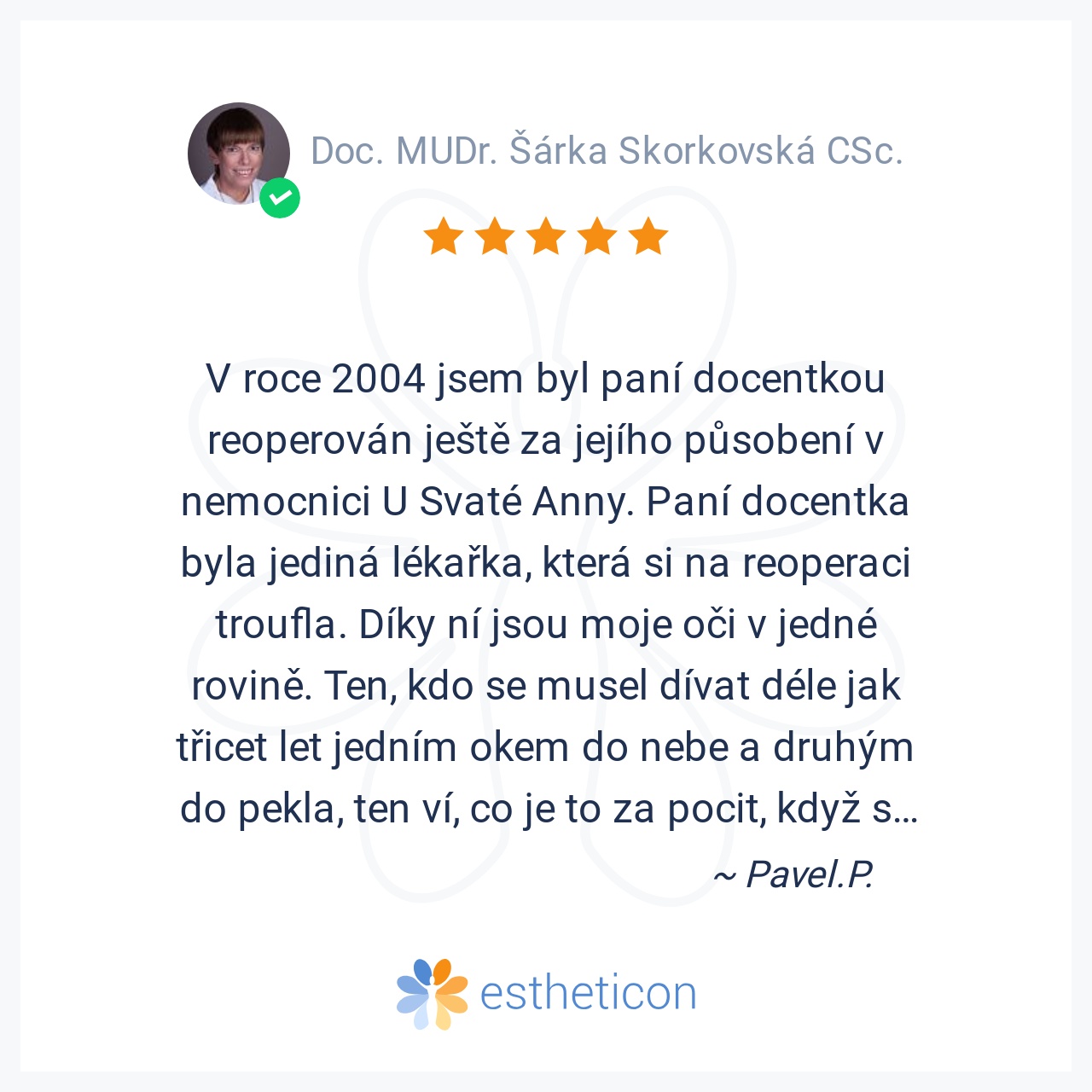 jsem velmi spokojená, po zákroku se mi zrak zlepšil, oceňuji odborný i lidský přístup p. doc. Skorkovské