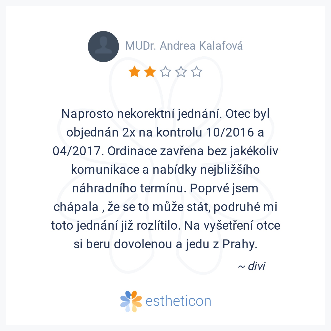 Naprosto nekorektní jednání. Otec byl objednán 2x na kontrolu 10/2016 a 04/2017. Ordinace zavřena bez jakékoliv komunikace a nabídky nejbližšího náhradního termínu. Poprvé jsem chápala , že se to může stát, podruhé mi to... Více