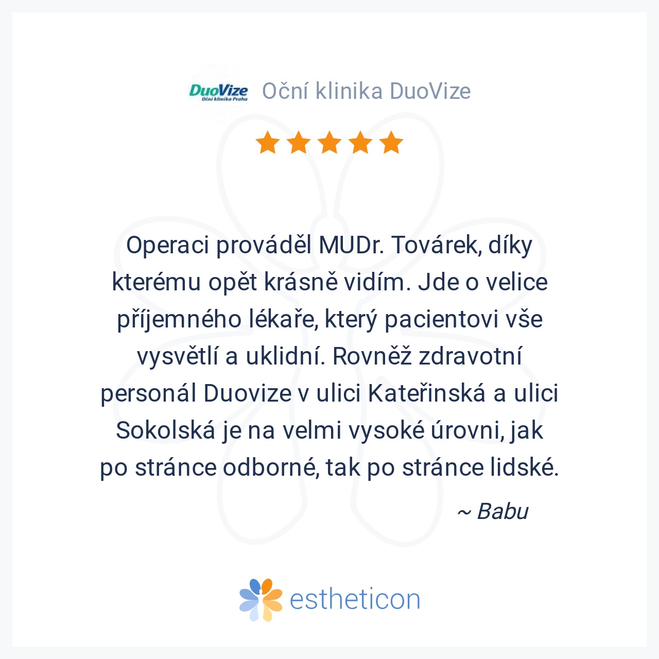 Operaci prováděl MUDr. Továrek, díky kterému opět krásně vidím. Jde o velice příjemného lékaře, který pacientovi vše vysvětlí a uklidní. Rovněž zdravotní personál Duovize v ulici Kateřinská a ulici Sokolská je na velmi v... Více