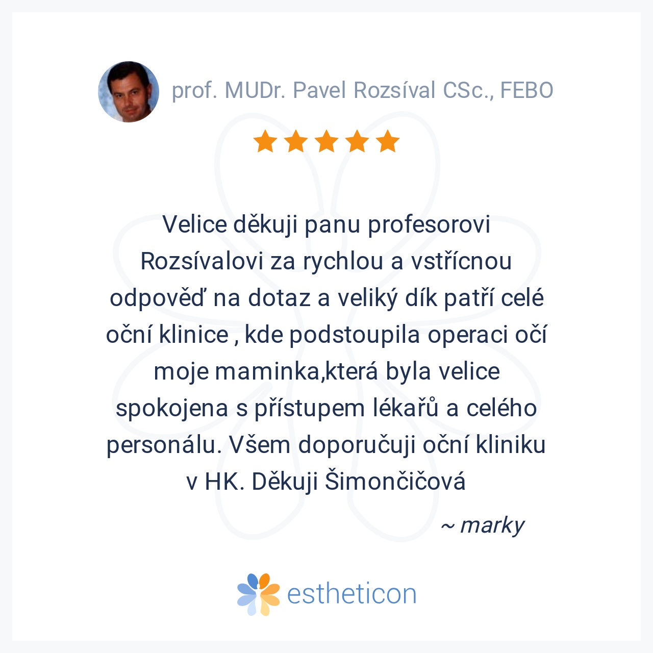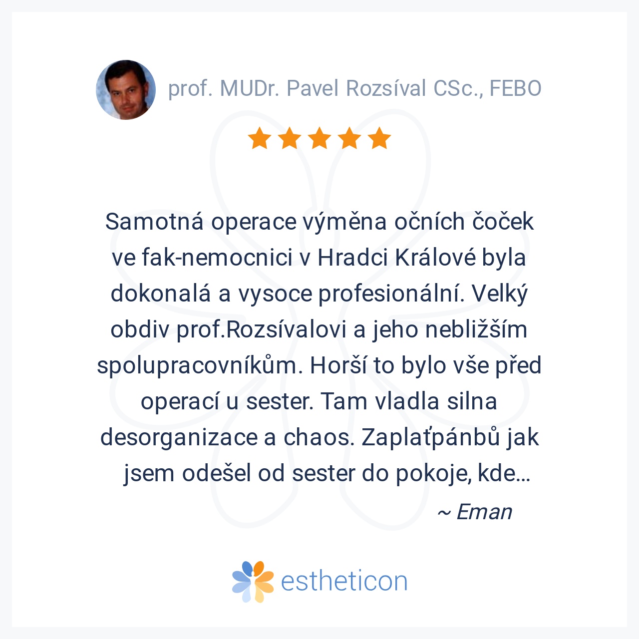 Pan prof. MUDr. Pavel Rozsíval CSc. velmi ochotně a rychle předal moji prosbu příslušné odborné lékařce oční kliniky FN v Hradci Králové a o tomto mě obratem informoval. Ještě týž dne mě kontaktovala odborná oční lékařka... Více