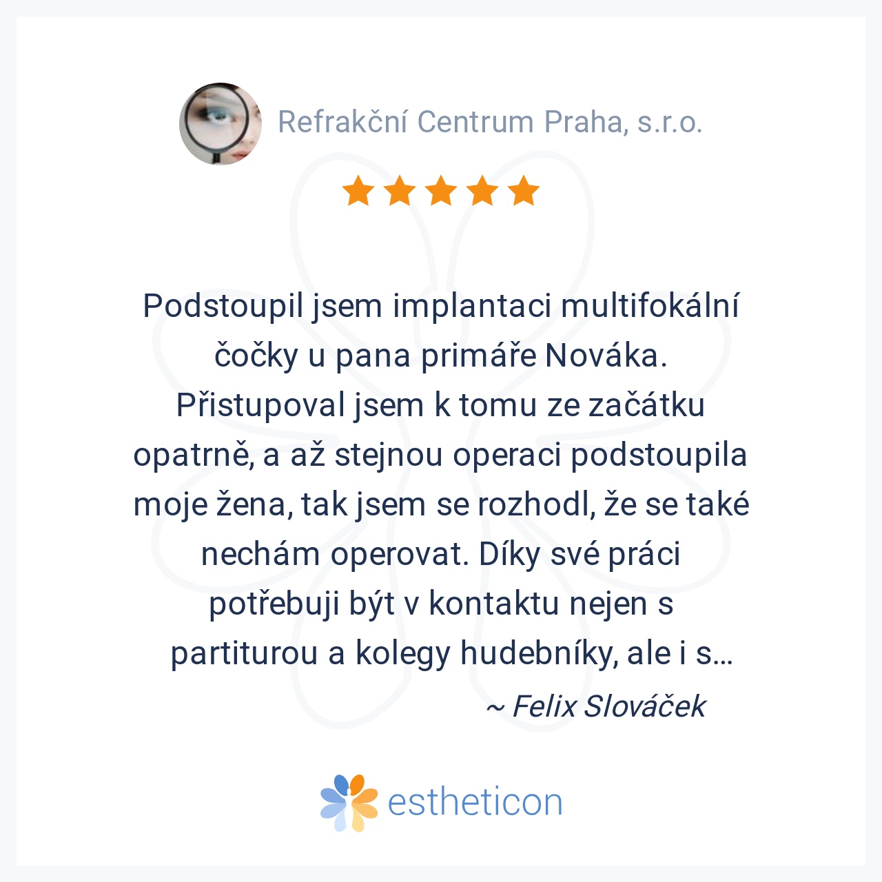 Podstoupil jsem implantaci multifokální čočky u pana primáře Nováka. Přistupoval jsem k tomu ze začátku opatrně, a až stejnou operaci podstoupila moje žena, tak jsem se rozhodl, že se také nechám operovat. Díky své práci... Více