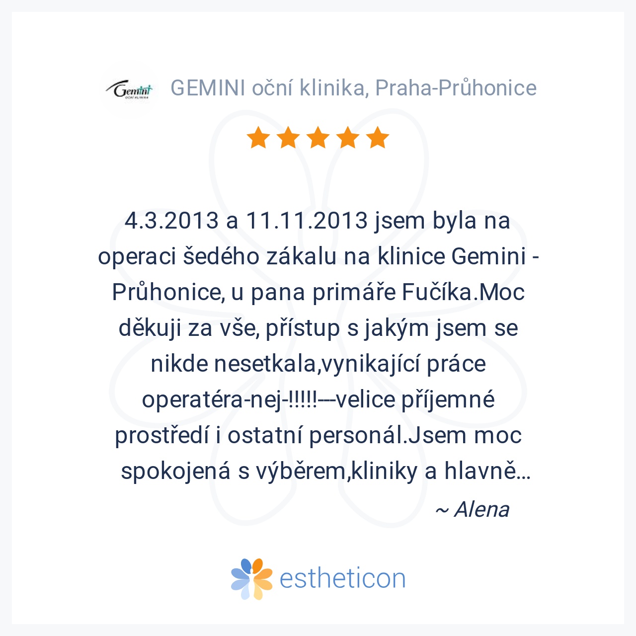 4.3.2013 a 11.11.2013 jsem byla na operaci šedého zákalu na klinice Gemini - Průhonice, u pana primáře Fučíka.Moc děkuji za vše, přístup s jakým jsem se nikde nesetkala,vynikající práce operatéra-nej-!!!!!---velice p... Více