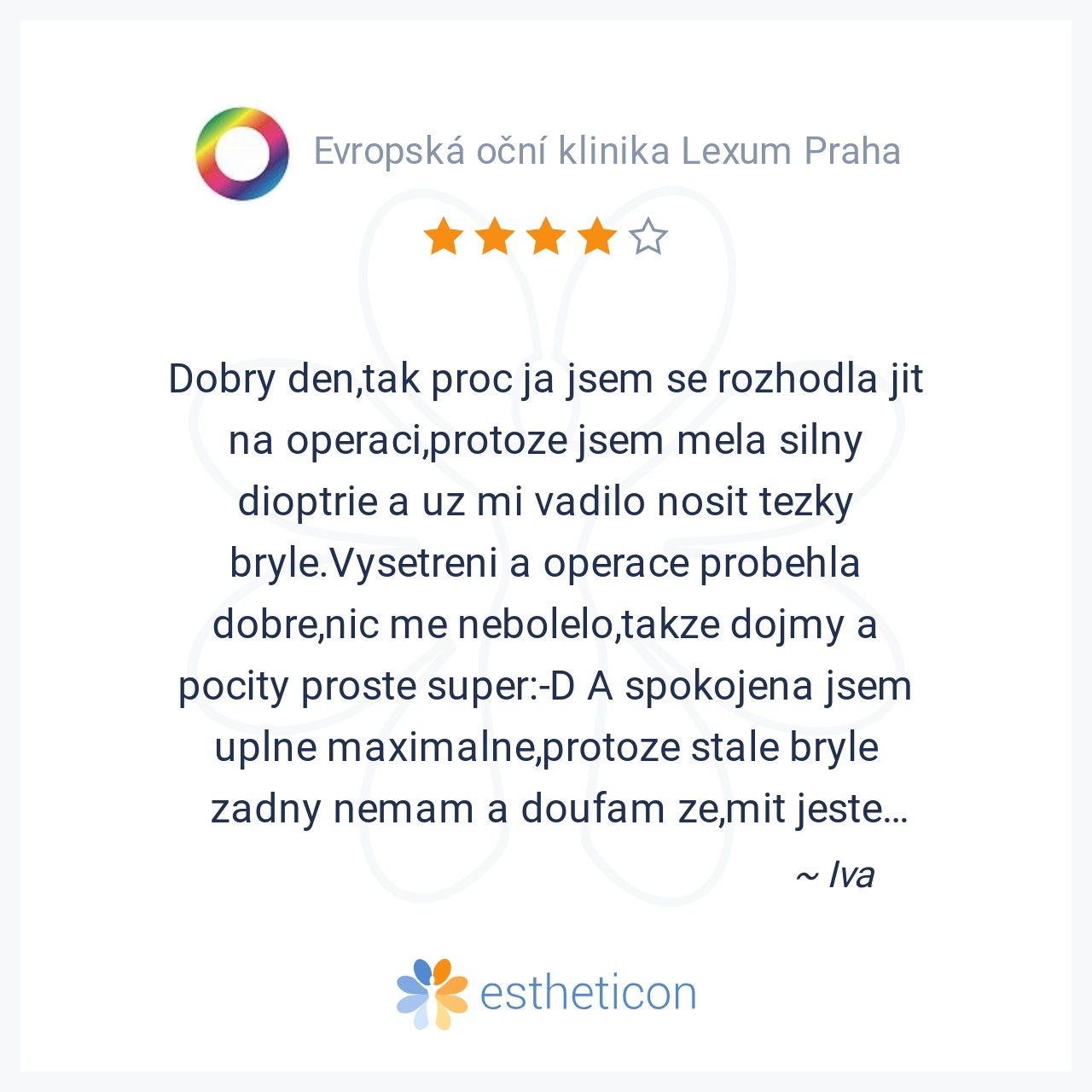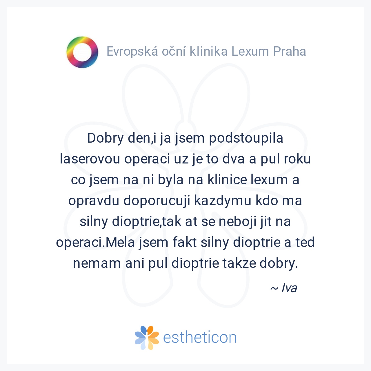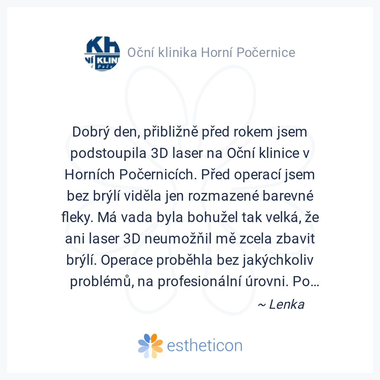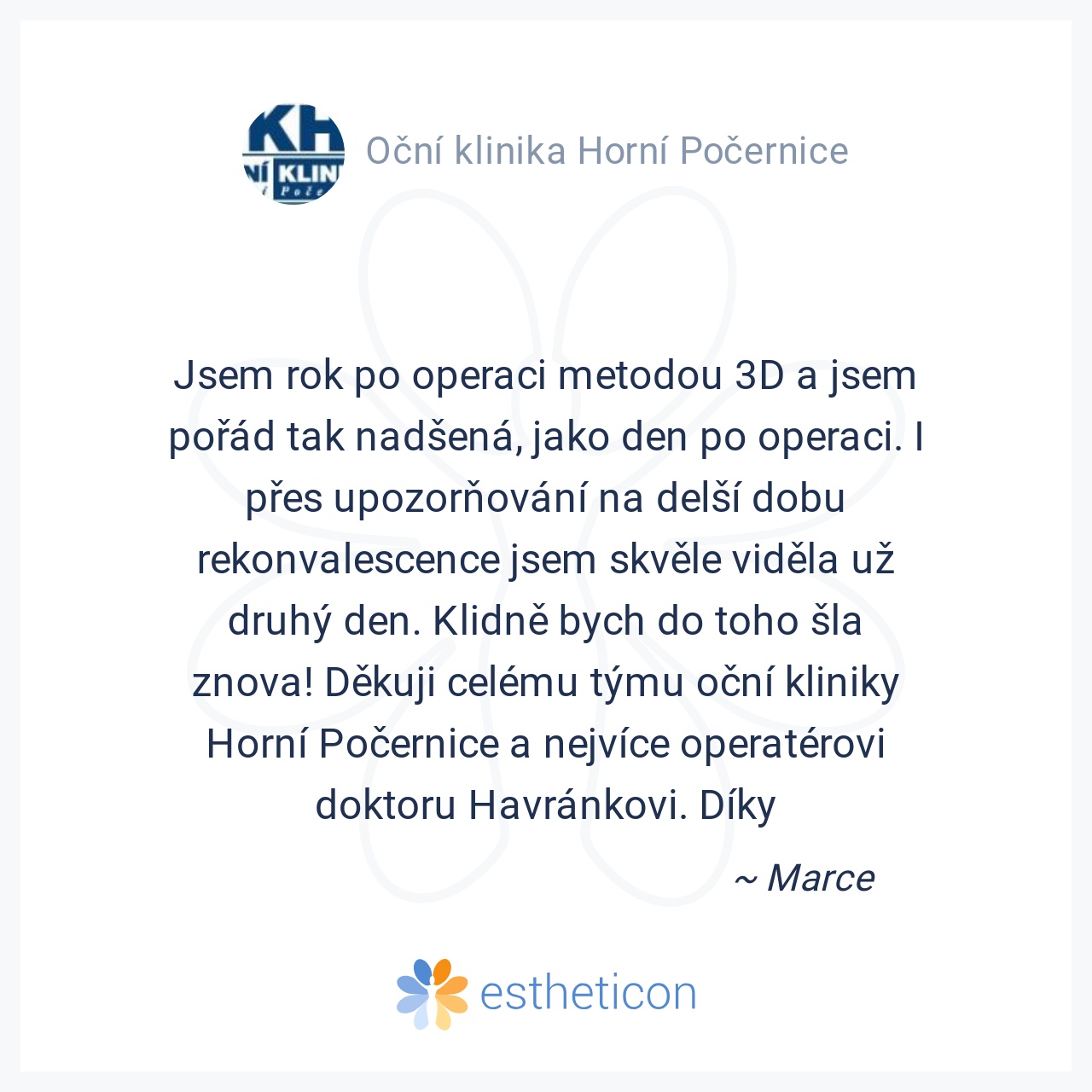 Jsem rok po operaci metodou 3D a jsem pořád tak nadšená, jako den po operaci. I přes upozorňování na delší dobu rekonvalescence jsem skvěle viděla už druhý den. Klidně bych do toho šla znova! Děkuji celému týmu oční klin... Více