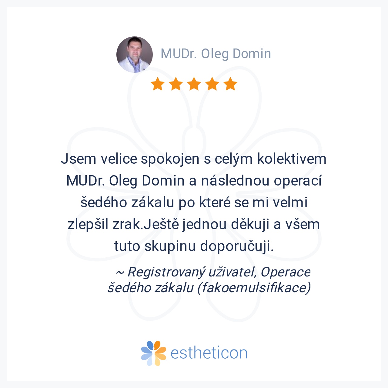 Jsem velice spokojen s celým kolektivem MUDr. Oleg Domin a následnou operací šedého zákalu po které se mi velmi zlepšil zrak.Ještě jednou děkuji a všem tuto skupinu doporučuji.