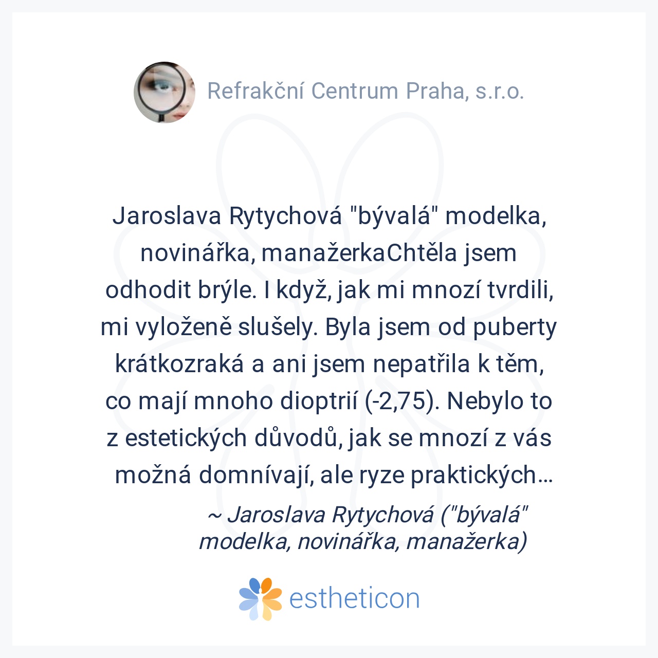 Jaroslava Rytychová "bývalá" modelka, novinářka, manažerkaChtěla jsem odhodit brýle. I když, jak mi mnozí tvrdili, mi vyloženě slušely. Byla jsem od puberty krátkozraká a ani jsem nepatřila k těm, co mají mnoho dioptrií ... Více