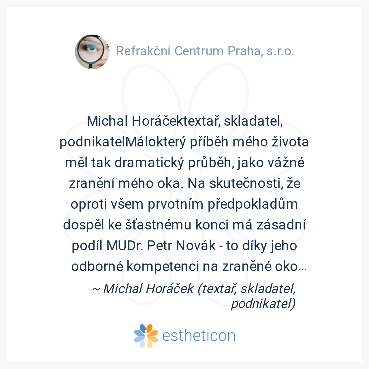 Michal Horáčektextař, skladatel, podnikatelMálokterý příběh mého života měl tak dramatický průběh, jako vážné zranění mého oka. Na skutečnosti, že oproti všem prvotním předpokladům dospěl ke šťastnému konci má zásadní po... Více