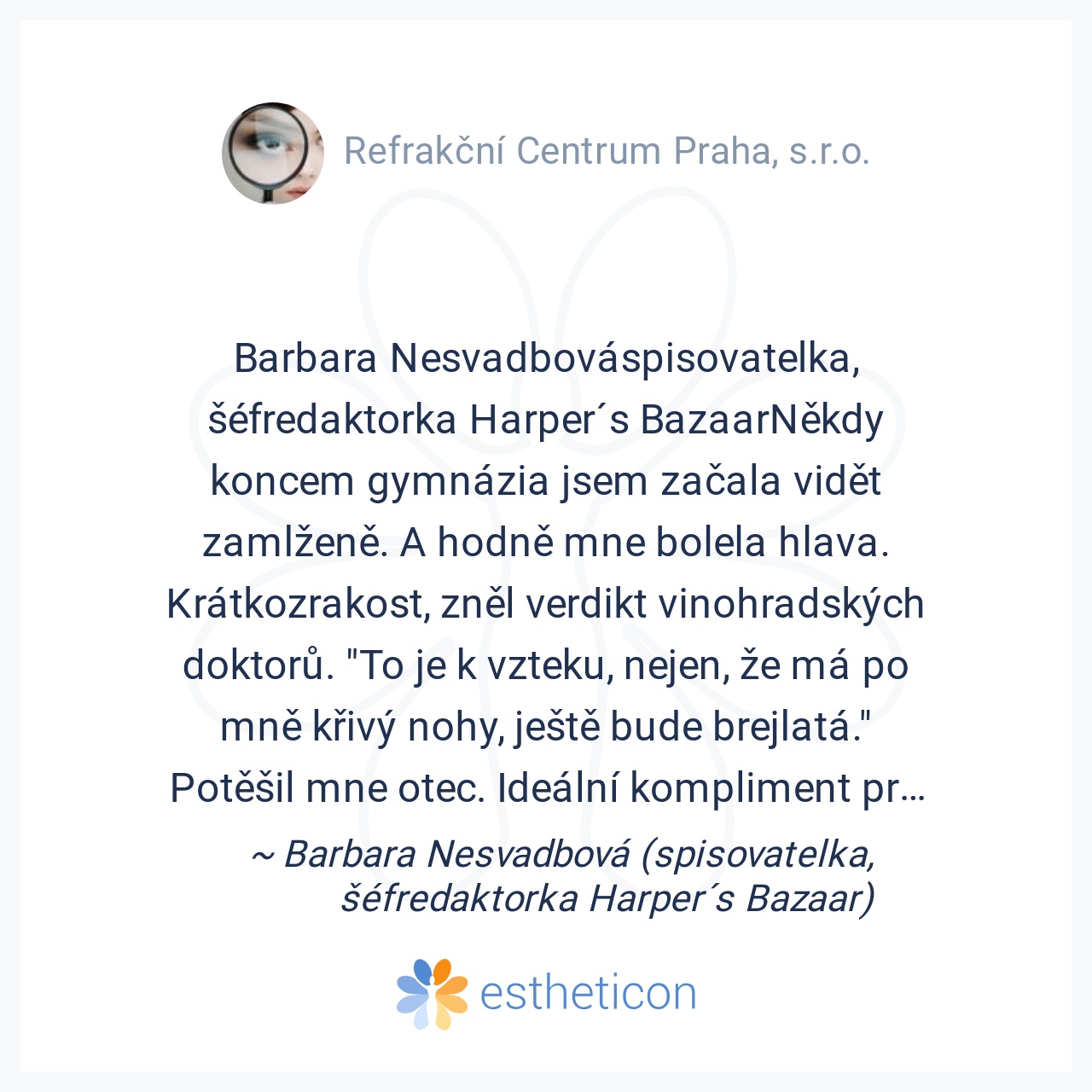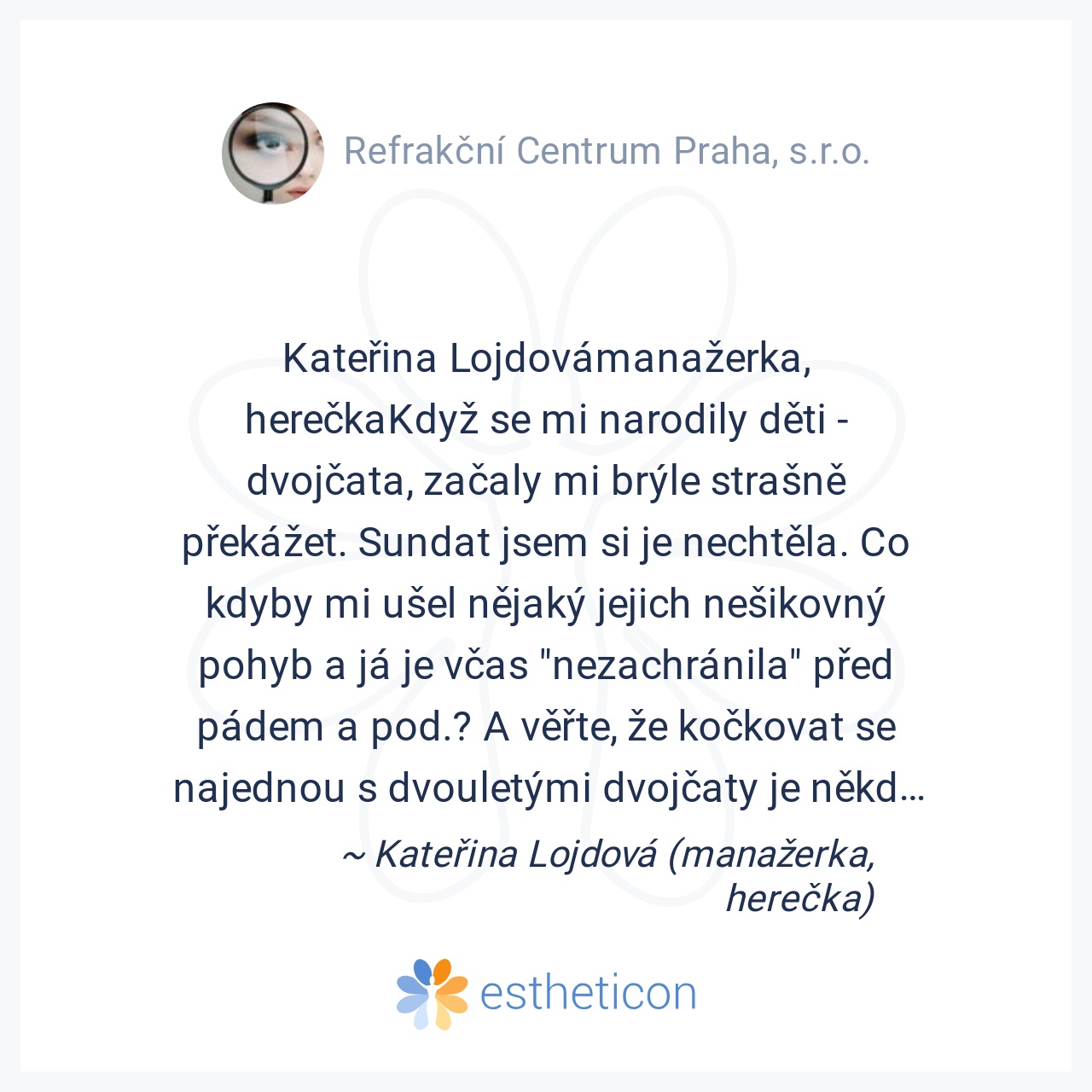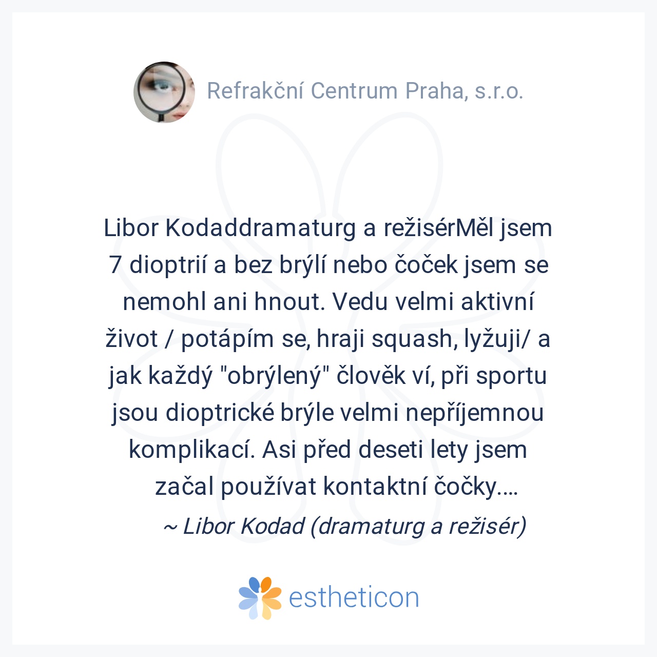 MUDr. Michaela RýzlováBrýle na dálku jsem nosila od svých cca 8 let, zprvu jen na dálku a poté od střední školy již trvale. K operaci očí jsem se rozhodla po řadě let váhání a shromažďování hlavně medicínských důkazů, že... Více