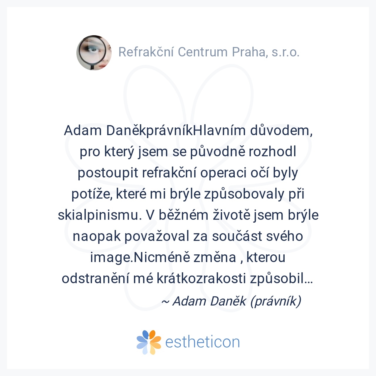 Adam DaněkprávníkHlavním důvodem, pro který jsem se původně rozhodl postoupit refrakční operaci očí byly potíže, které mi brýle způsobovaly při skialpinismu. V běžném životě jsem brýle naopak považoval za součást svého i... Více