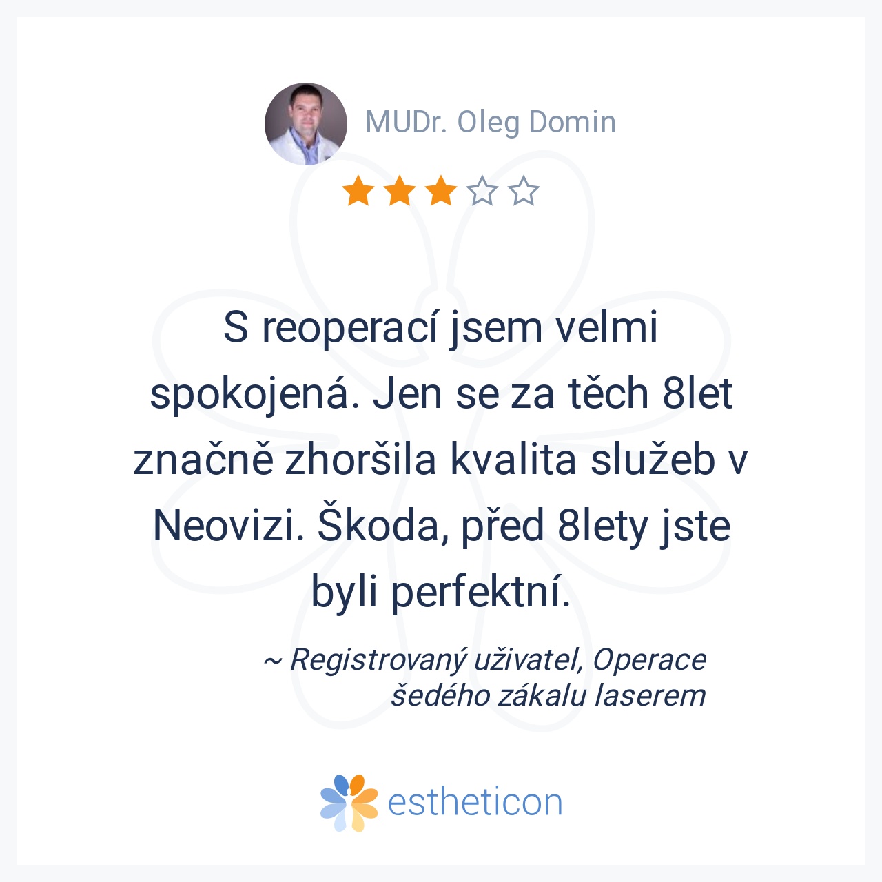 S reoperací jsem velmi spokojená. Jen se za těch 8let značně zhoršila kvalita služeb v Neovizi. Škoda, před 8lety jste byli perfektní.