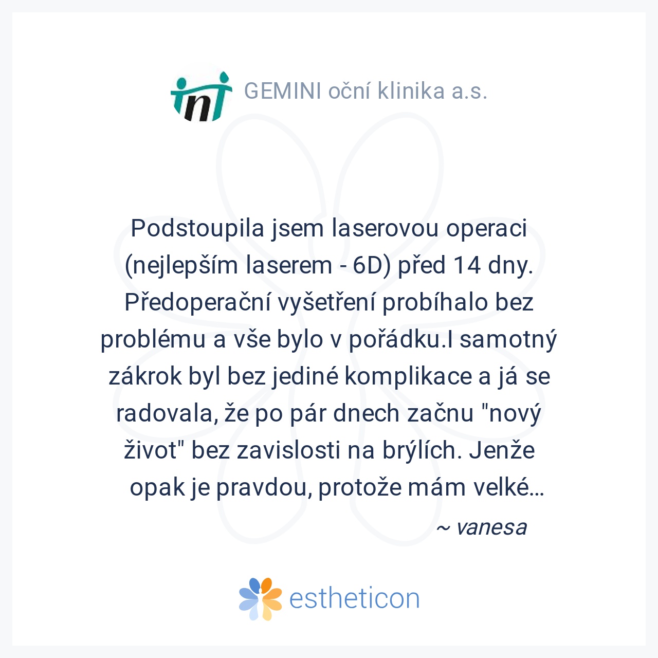 Podstoupila jsem laserovou operaci (nejlepším laserem - 6D) před 14 dny. Předoperační vyšetření probíhalo bez problému a vše bylo v pořádku.I samotný zákrok byl bez jediné komplikace a já se radovala, že po pár dnech zač... Více