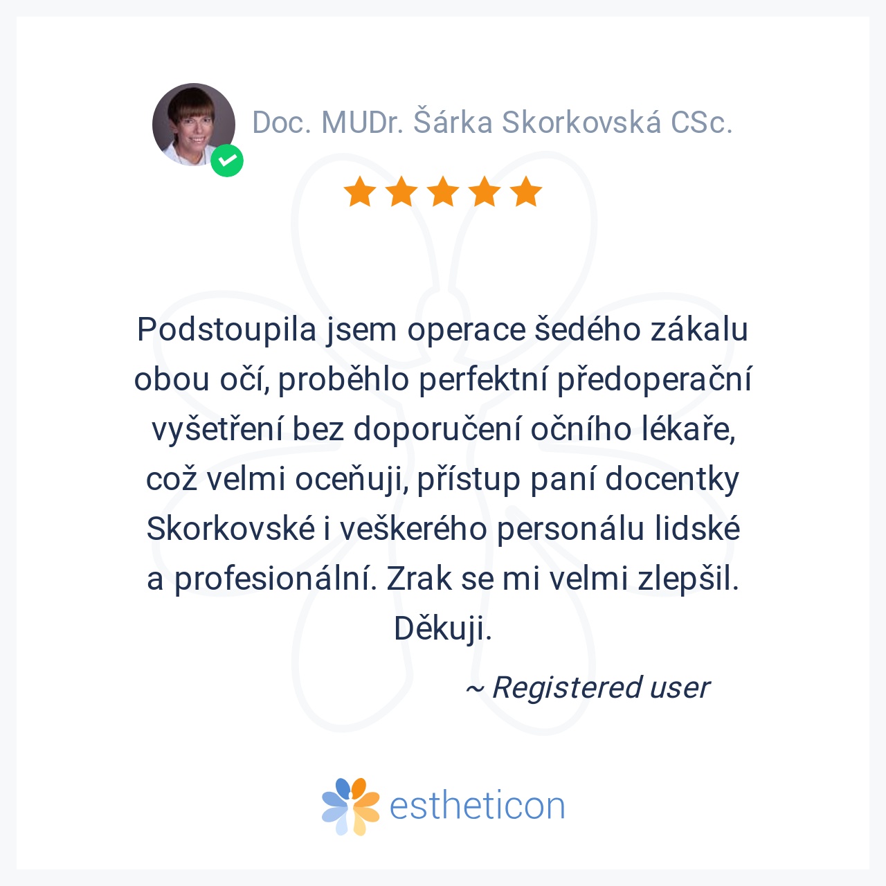 Podstoupila jsem operace šedého zákalu obou očí, proběhlo perfektní předoperační vyšetření bez doporučení očního lékaře, což velmi oceňuji, přístup paní docentky Skorkovské i veškerého personálu lidské a profesionální. Z... Více
