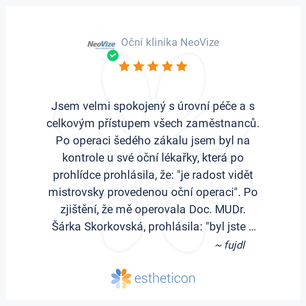 Jsem velmi spokojený s úrovní péče a s celkovým přístupem všech zaměstnanců. Po operaci šedého zákalu jsem byl na kontrole u své oční lékařky, která po prohlídce prohlásila, že: "je radost vidět mistrovsky provedenou očn... Více
