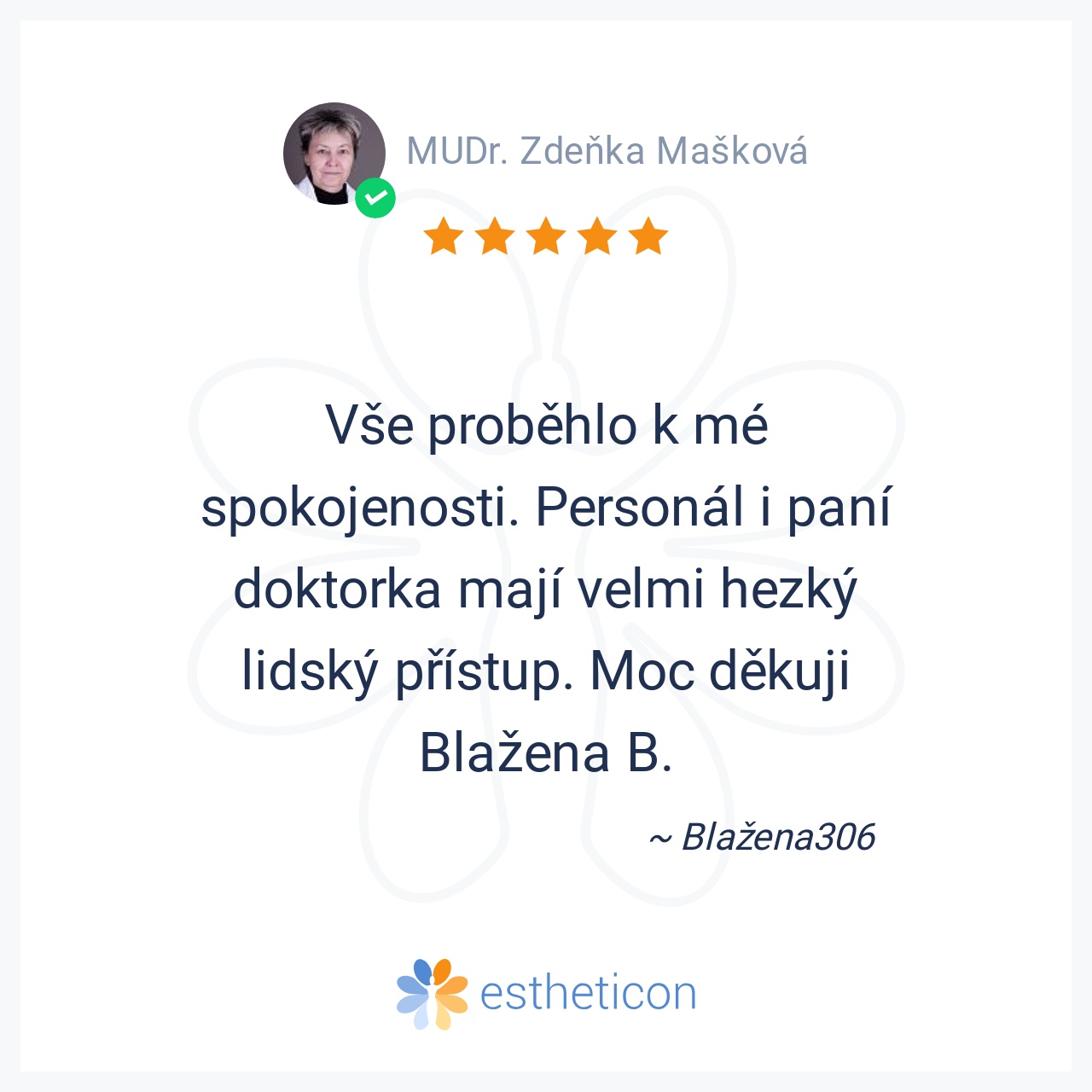 Vše proběhlo k mé spokojenosti. Personál i paní doktorka mají velmi hezký lidský přístup. Moc děkuji Blažena B.