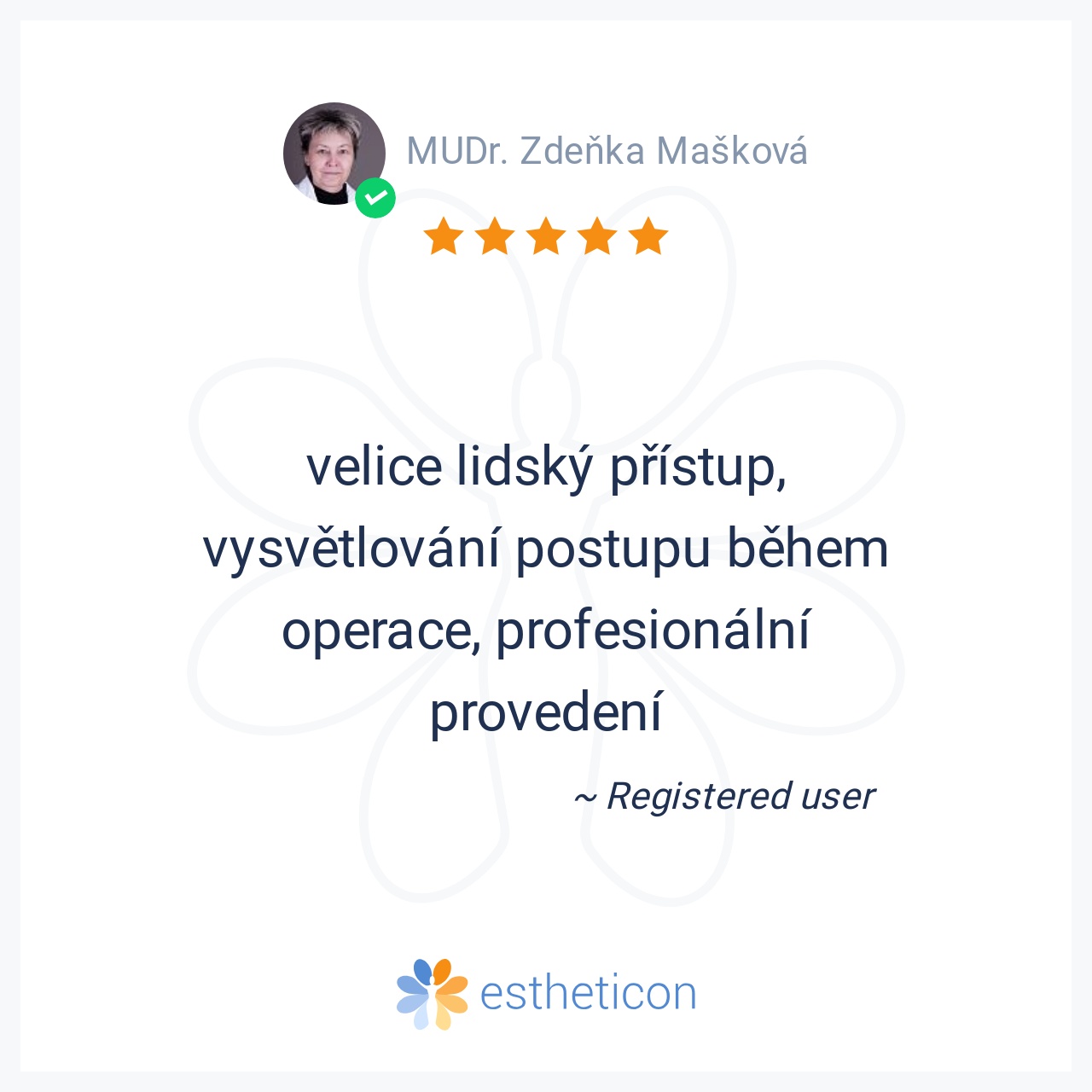 Skvělé. Paní docentka po celou dobu operace - cca 10 minut - mi stále říkala, co právě provádí, co mám v následující vteřině očekávat a bylo to bez jediného problému. Prostě žena na svém místě. Doporučuji. Miroslav Pokor... Více