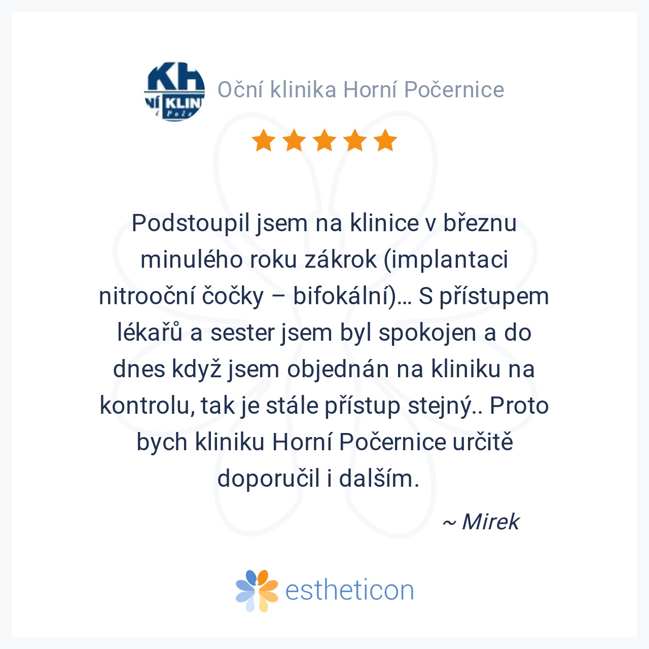 Podstoupil jsem na klinice v březnu minulého roku zákrok (implantaci nitrooční čočky – bifokální)… S přístupem lékařů a sester jsem byl spokojen a do dnes když jsem objednán na kliniku na kontrolu, tak je stále přístup s... Více