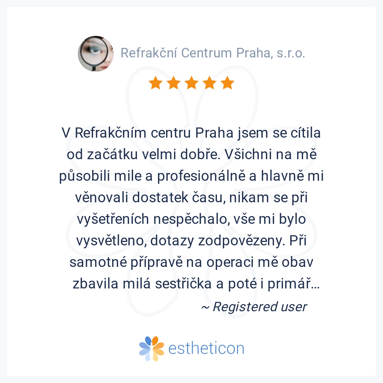 V Refrakčním centru Praha jsem se cítila od začátku velmi dobře. Všichni na mě působili mile a profesionálně a hlavně mi věnovali dostatek času, nikam se při vyšetřeních nespěchalo, vše mi bylo vysvětleno, dotazy zodpově... Více