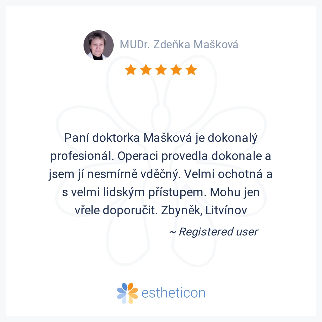 Paní doktorka Mašková je dokonalý profesionál. Operaci provedla dokonale a jsem jí nesmírně vděčný. Velmi ochotná a s velmi lidským přístupem. Mohu jen vřele doporučit. Zbyněk, Litvínov