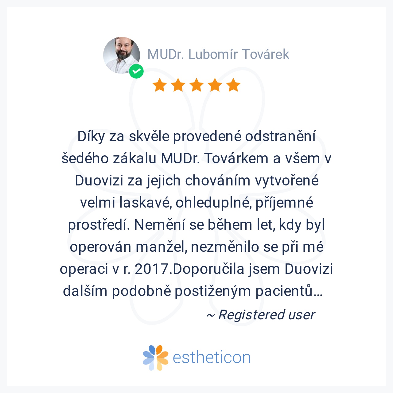 Díky za skvěle provedené odstranění šedého zákalu MUDr. Továrkem a všem v Duovizi za jejich chováním vytvořené velmi laskavé, ohleduplné, příjemné prostředí. Nemění se během let, kdy byl operován manžel, nezměnilo se při... Více