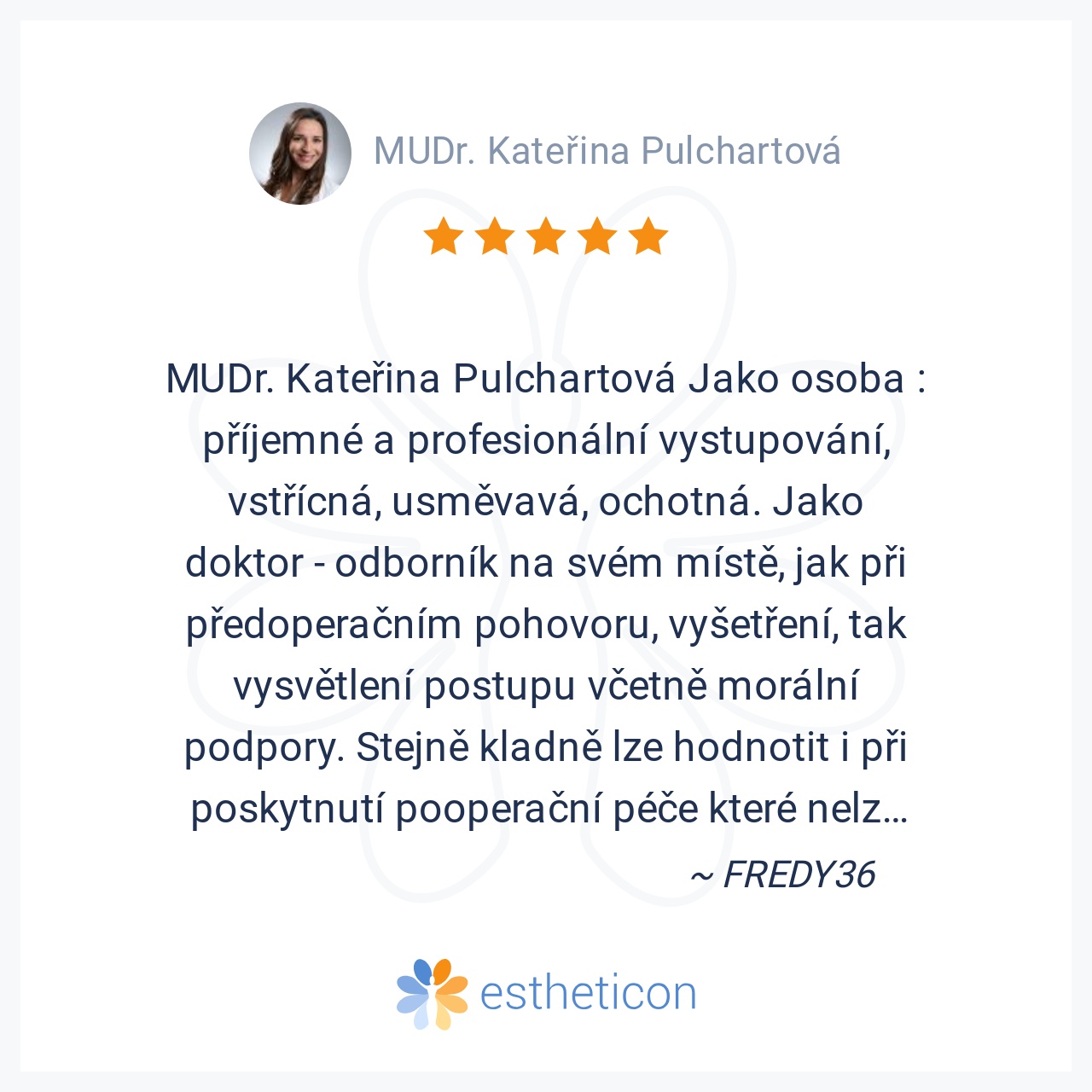 MUDr. Kateřina Pulchartová Jako osoba : příjemné a profesionální vystupování, vstřícná, usměvavá, ochotná. Jako doktor - odborník na svém místě, jak při předoperačním pohovoru, vyšetření, tak vysvětlení postupu včetně mo... Více