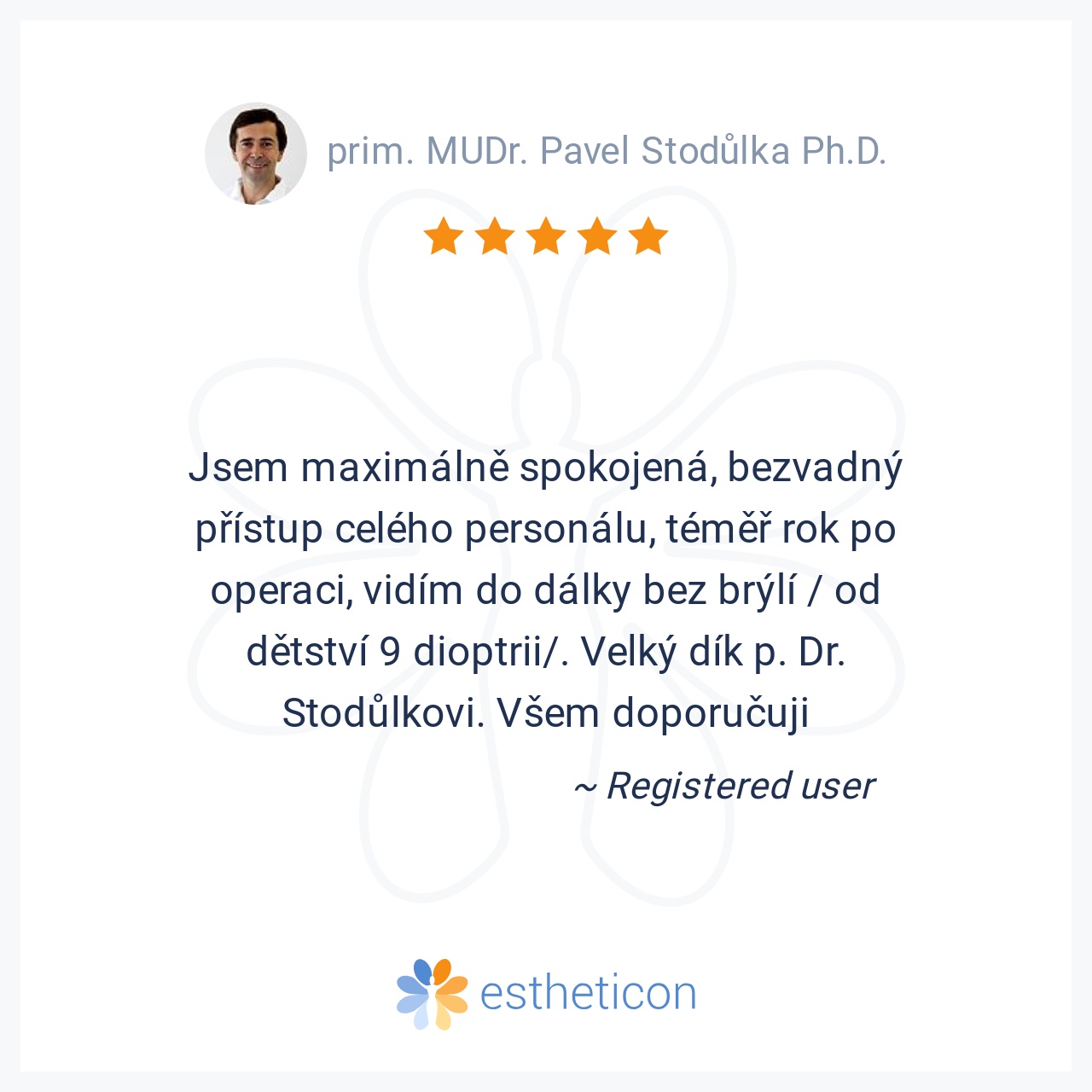 Jsem maximálně spokojená, bezvadný přístup celého personálu, téměř rok po operaci, vidím do dálky bez brýlí / od dětství 9 dioptrii/. Velký dík p. Dr. Stodůlkovi. Všem doporučuji