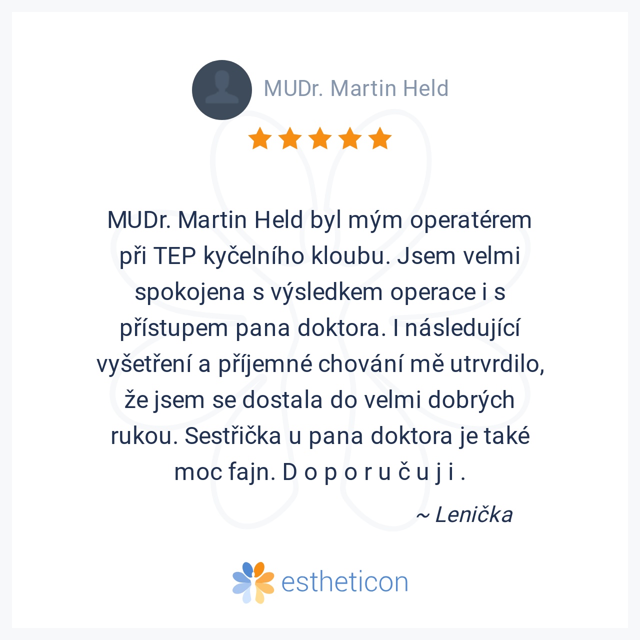 MUDr. Martin Held byl mým operatérem při TEP kyčelního kloubu. Jsem velmi spokojena s výsledkem operace i s přístupem pana doktora. I následující vyšetření a příjemné chování mě utrvrdilo, že jsem se dostala do velmi dob... Více