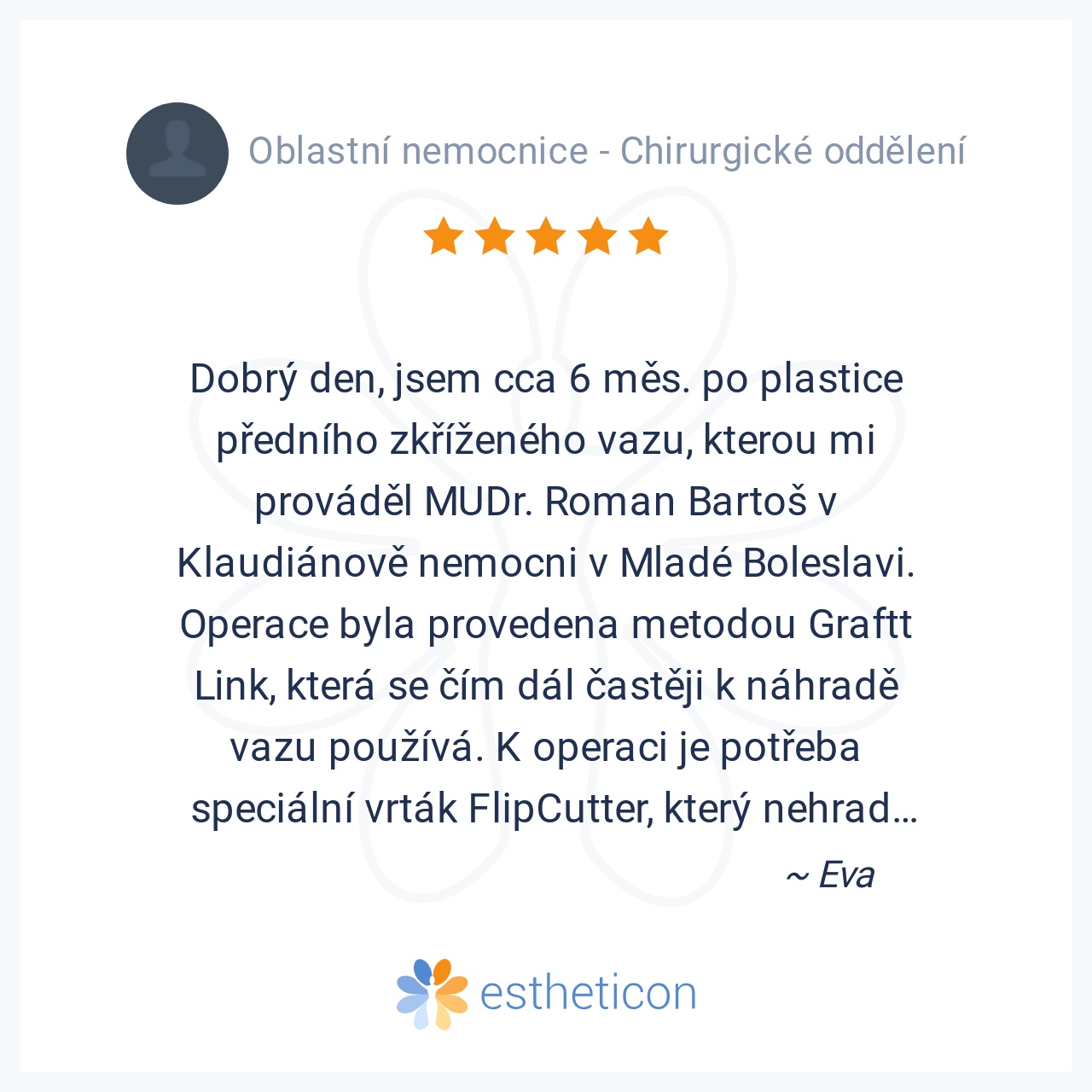 Dobrý den, jsem cca 6 měs. po plastice předního zkříženého vazu, kterou mi prováděl MUDr. Roman Bartoš v Klaudiánově nemocni v Mladé Boleslavi. Operace byla provedena metodou Graftt Link, která se čím dál častěji k náhra... Více