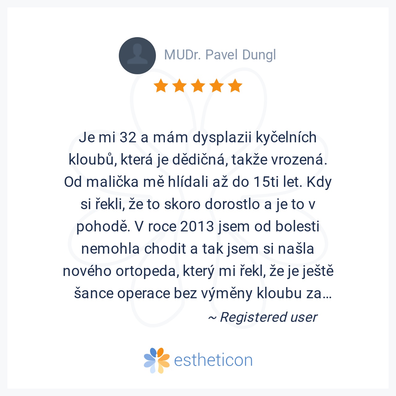 V dubnu 2022 jsem byla operována MUDr. Gutwaldem ve Slaném. Jsem moc spokojená, jak s výsledkem operace, tak i s lidským přístupem a následnou péčí. Po dvou letech o berlích a v bolestech, jsem dnes po půl roce od operac... Více