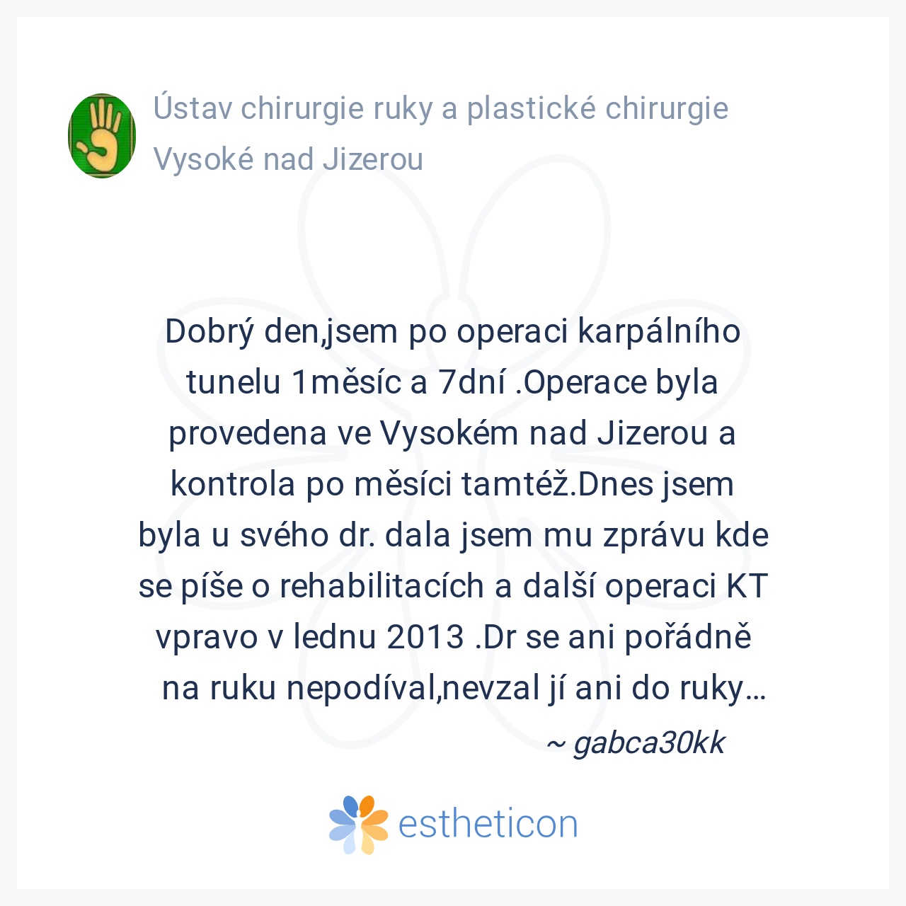 Dobrý den,jsem po operaci karpálního tunelu 1měsíc a 7dní .Operace byla provedena ve Vysokém nad Jizerou a kontrola po měsíci tamtéž.Dnes jsem byla u svého dr. dala jsem mu zprávu kde se píše o rehabilitacích a další ope... Více