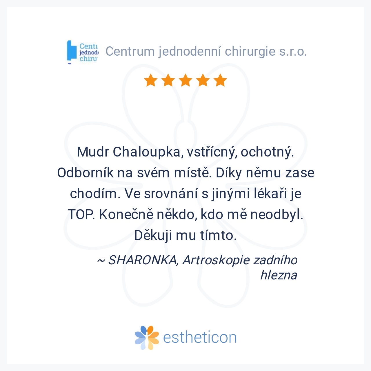 Mudr Chaloupka, vstřícný, ochotný. Odborník na svém místě. Díky němu zase chodím. Ve srovnání s jinými lékaři je TOP. Konečně někdo, kdo mě neodbyl. Děkuji mu tímto.
