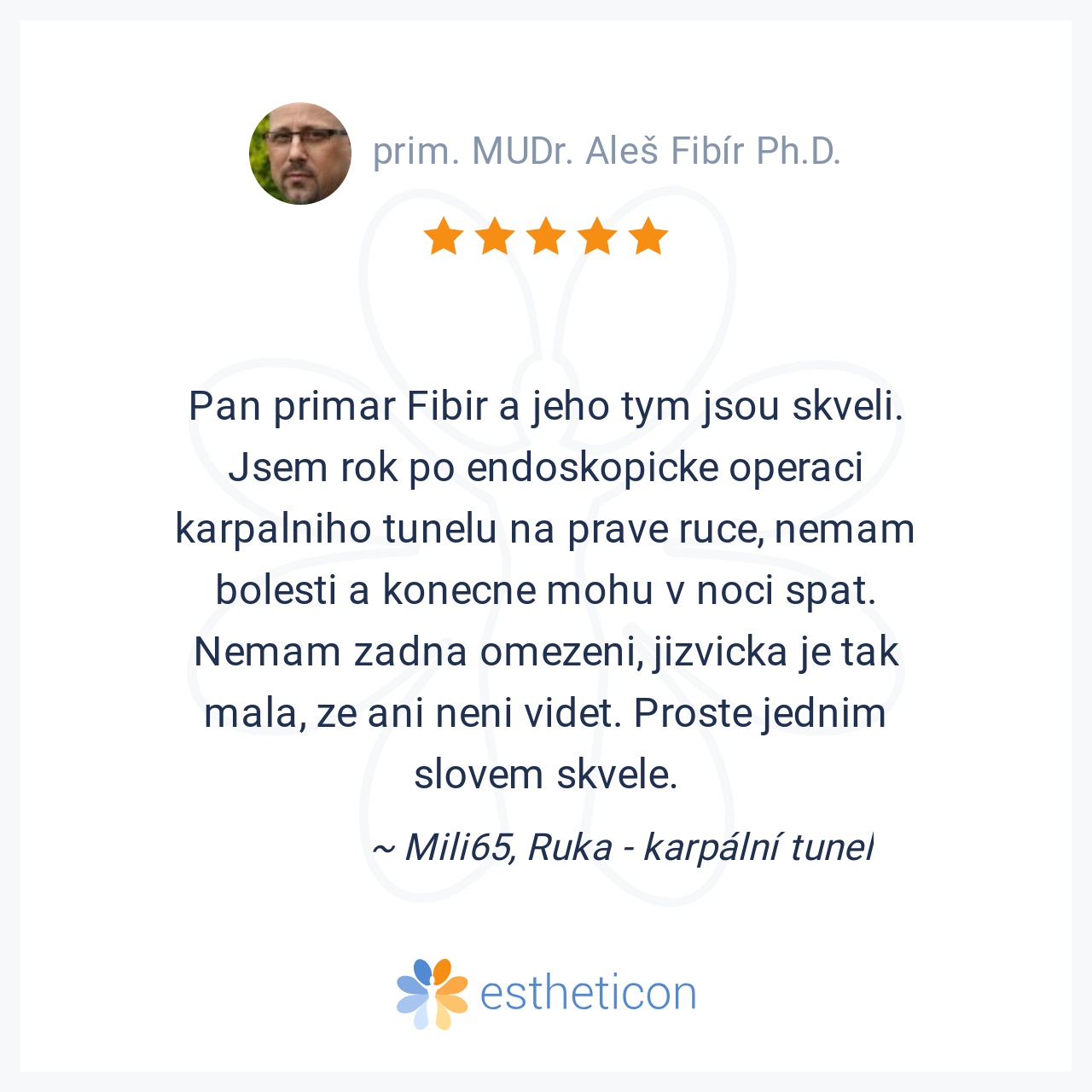 Pan primar Fibir a jeho tym jsou skveli. Jsem rok po endoskopicke operaci karpalniho tunelu na prave ruce, nemam bolesti a konecne mohu v noci spat. Nemam zadna omezeni, jizvicka je tak mala, ze ani neni videt. Proste je... Více