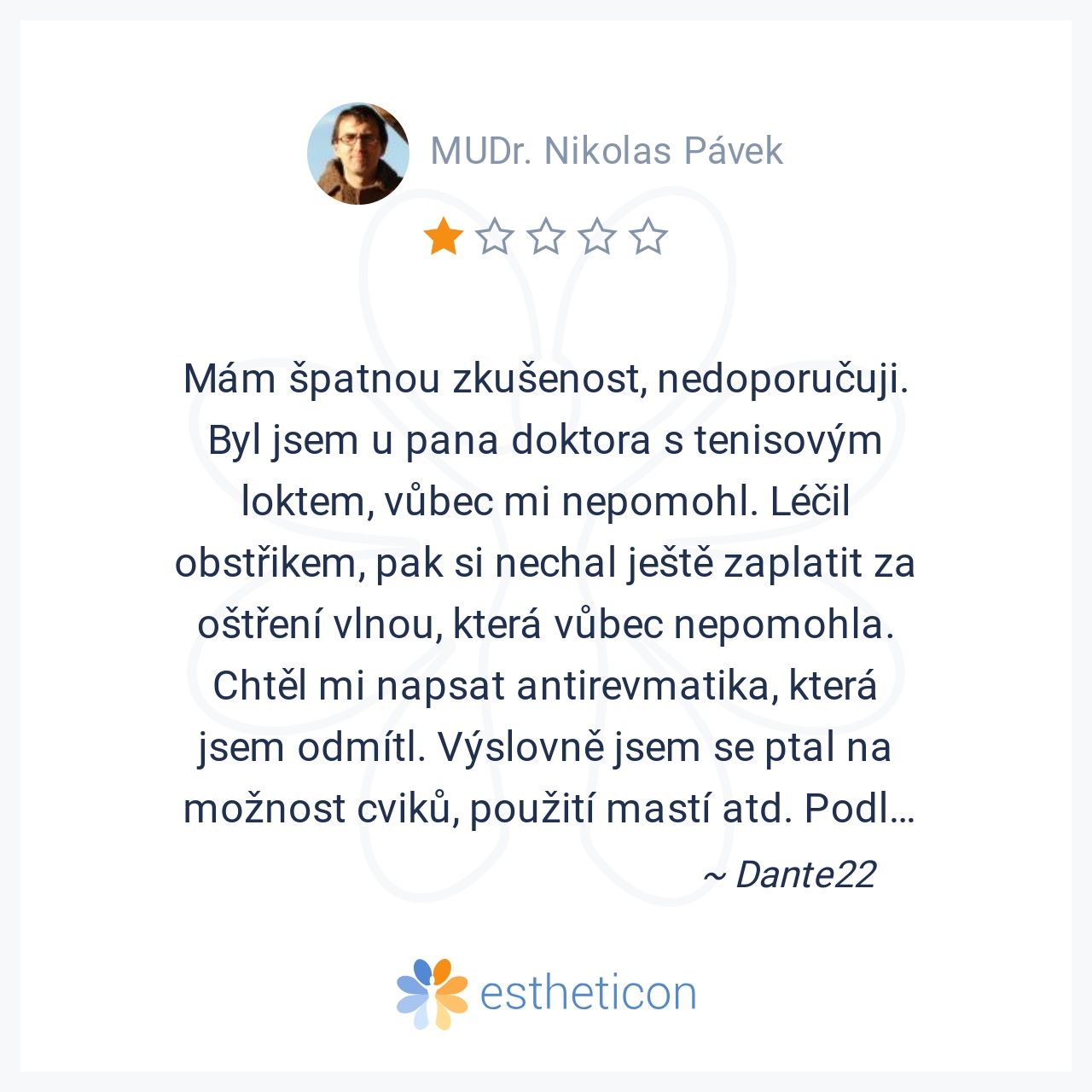 Mám špatnou zkušenost, nedoporučuji. Byl jsem u pana doktora s tenisovým loktem, vůbec mi nepomohl. Léčil obstřikem, pak si nechal ještě zaplatit za oštření vlnou, která vůbec nepomohla. Chtěl mi napsat antirevmatika, kt... Více