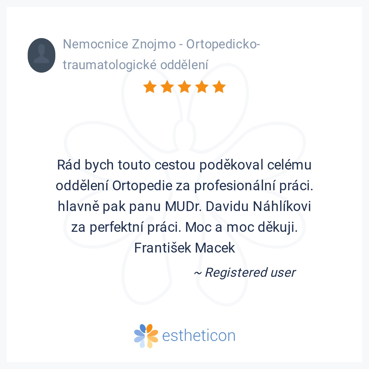 Rád bych touto cestou poděkoval celému oddělení Ortopedie za profesionální práci. hlavně pak panu MUDr. Davidu Náhlíkovi za perfektní práci. Moc a moc děkuji. František Macek