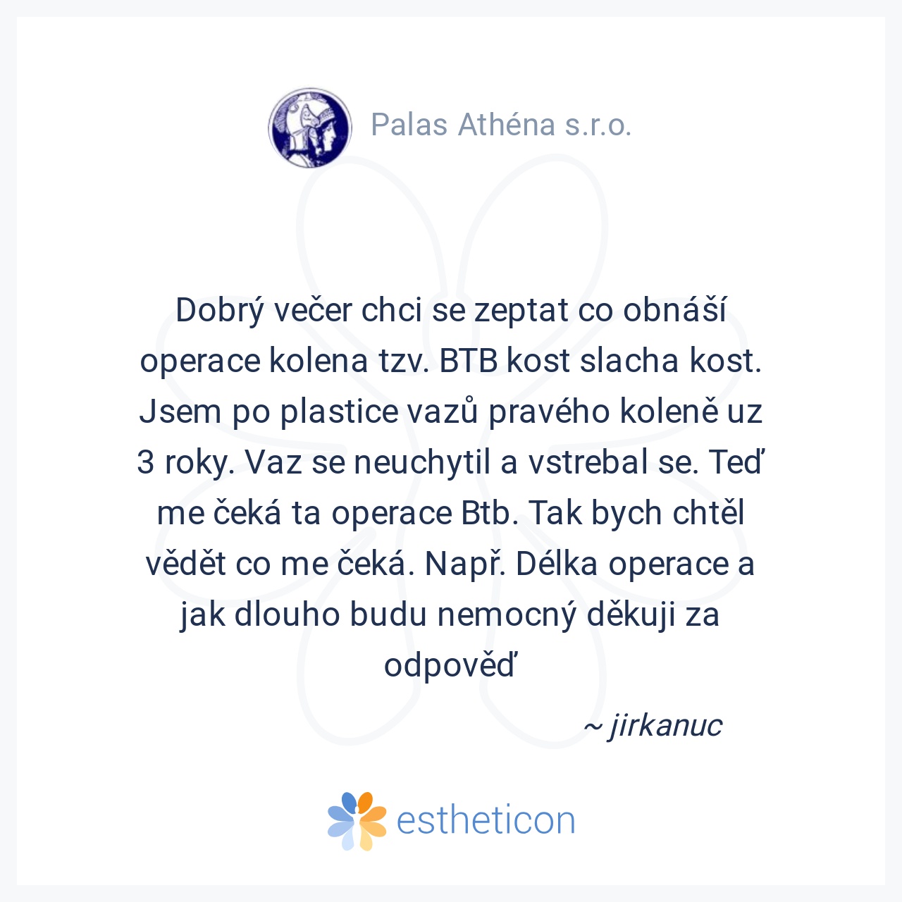 Dobrý večer chci se zeptat co obnáší operace kolena tzv. BTB kost slacha kost. Jsem po plastice vazů pravého koleně uz 3 roky. Vaz se neuchytil a vstrebal se. Teď me čeká ta operace Btb. Tak bych chtěl vědět co me čeká. ... Více