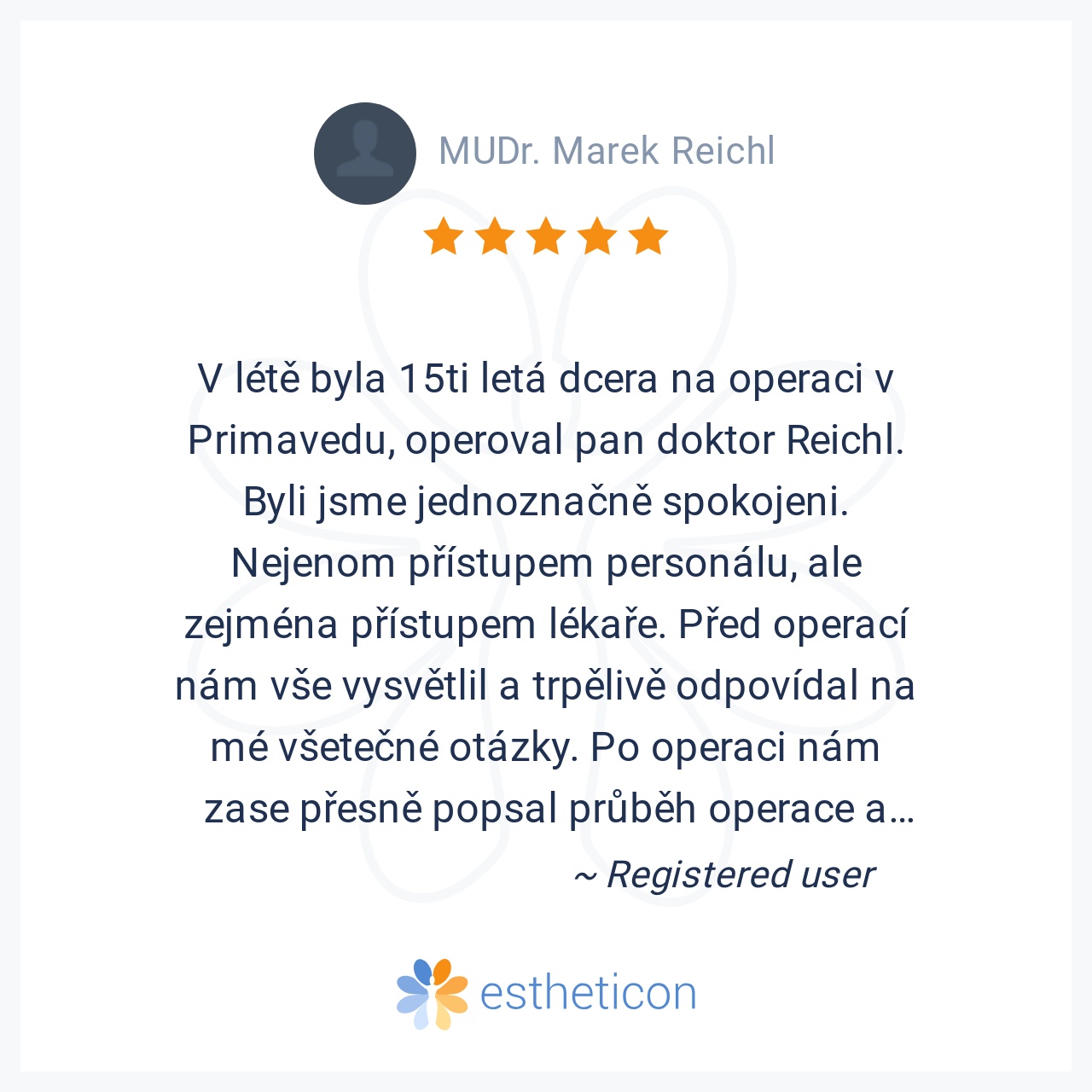 V létě byla 15ti letá dcera na operaci v Primavedu, operoval pan doktor Reichl. Byli jsme jednoznačně spokojeni. Nejenom přístupem personálu, ale zejména přístupem lékaře. Před operací nám vše vysvětlil a trpělivě odpoví... Více
