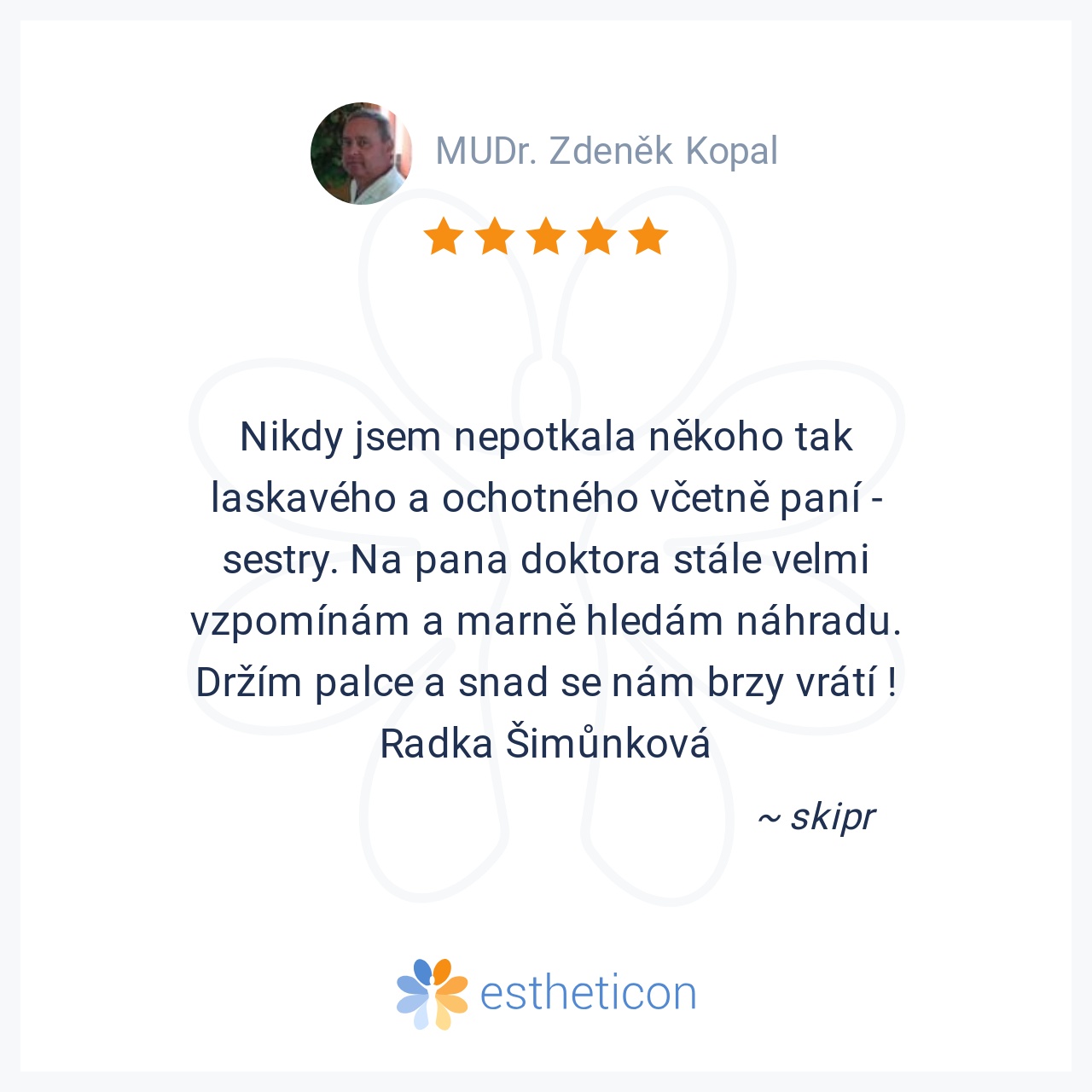 Nikdy jsem nepotkala někoho tak laskavého a ochotného včetně paní - sestry. Na pana doktora stále velmi vzpomínám a marně hledám náhradu. Držím palce a snad se nám brzy vrátí ! Radka Šimůnková