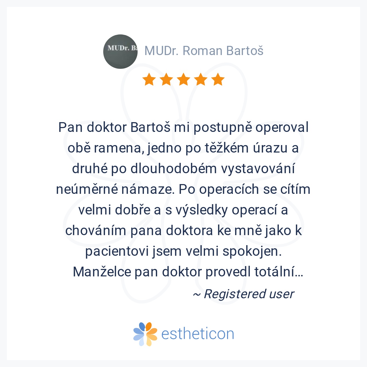 Pan doktor Bartoš mi postupně operoval obě ramena, jedno po těžkém úrazu a druhé po dlouhodobém vystavování neúměrné námaze. Po operacích se cítím velmi dobře a s výsledky operací a chováním pana doktora ke mně jako k pa... Více