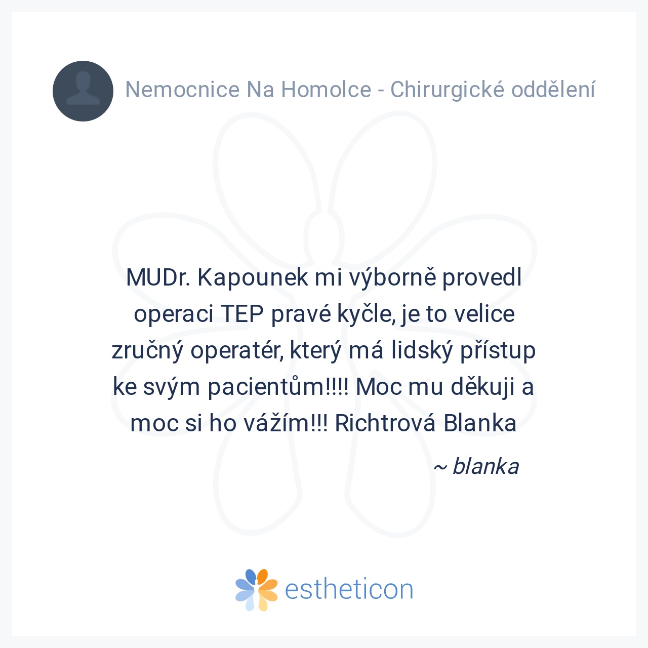 MUDr. Kapounek mi výborně provedl operaci TEP pravé kyčle, je to velice zručný operatér, který má lidský přístup ke svým pacientům!!!! Moc mu děkuji a moc si ho vážím!!! Richtrová Blanka