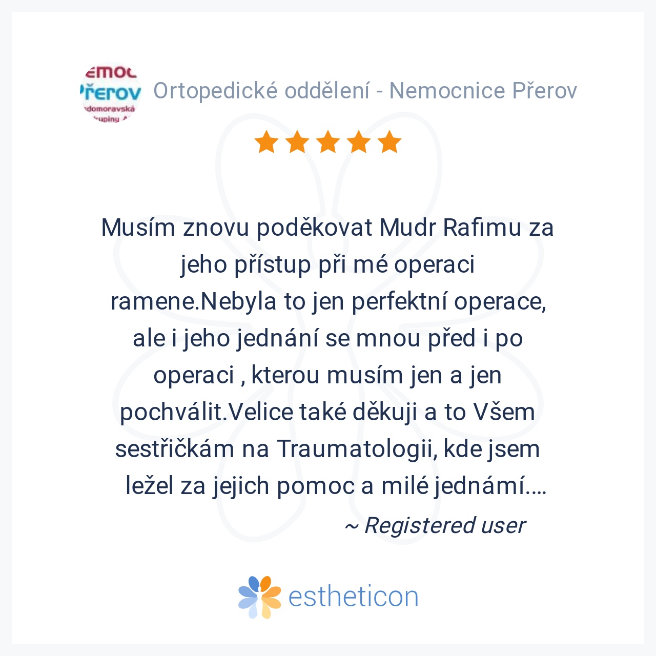Musím znovu poděkovat Mudr Rafimu za jeho přístup při mé operaci ramene.Nebyla to jen perfektní operace, ale i jeho jednání se mnou před i po operaci , kterou musím jen a jen pochválit.Velice také děkuji a to Všem sestř... Více