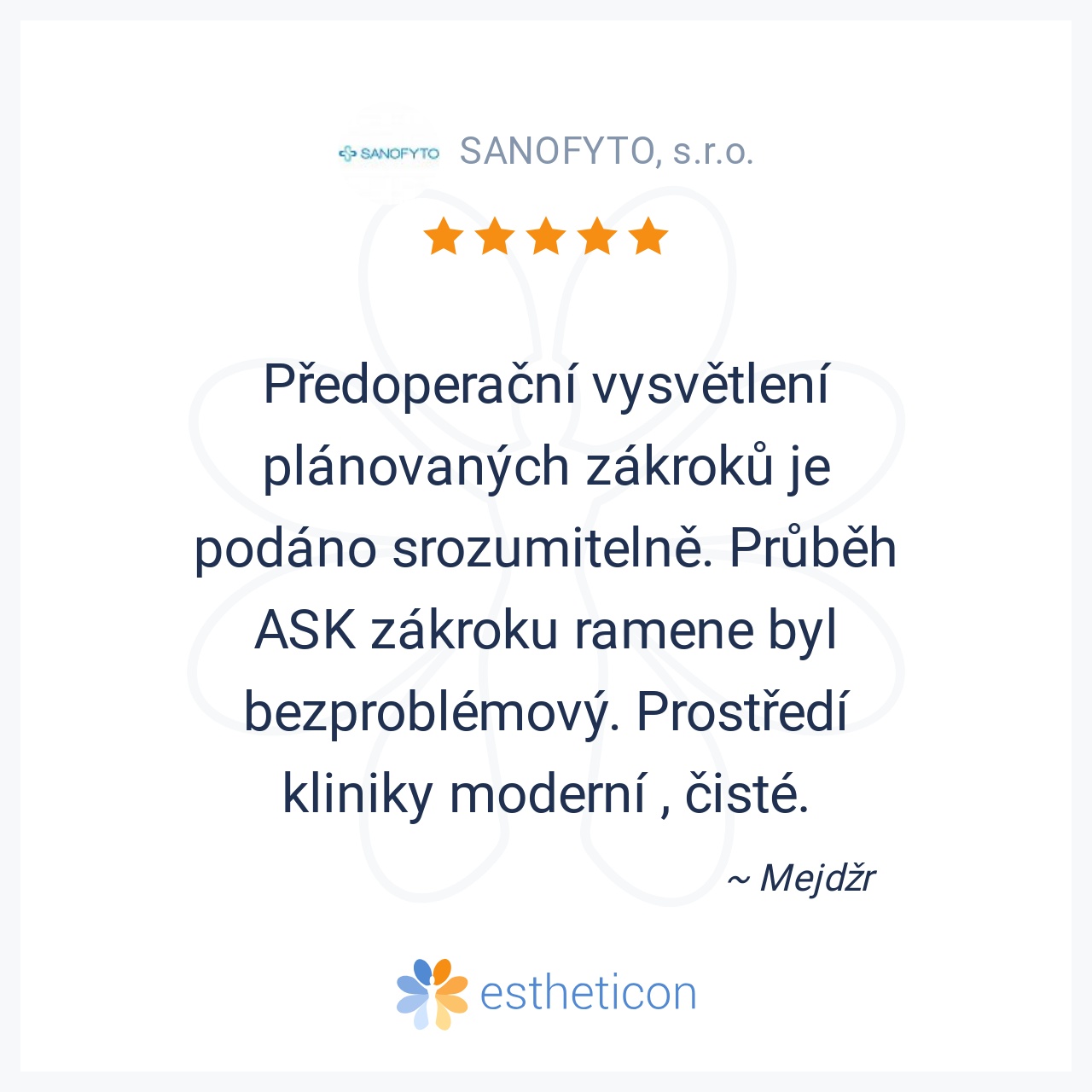 Předoperační vysvětlení plánovaných zákroků je podáno srozumitelně. Průběh ASK zákroku ramene byl bezproblémový. Prostředí kliniky moderní , čisté.