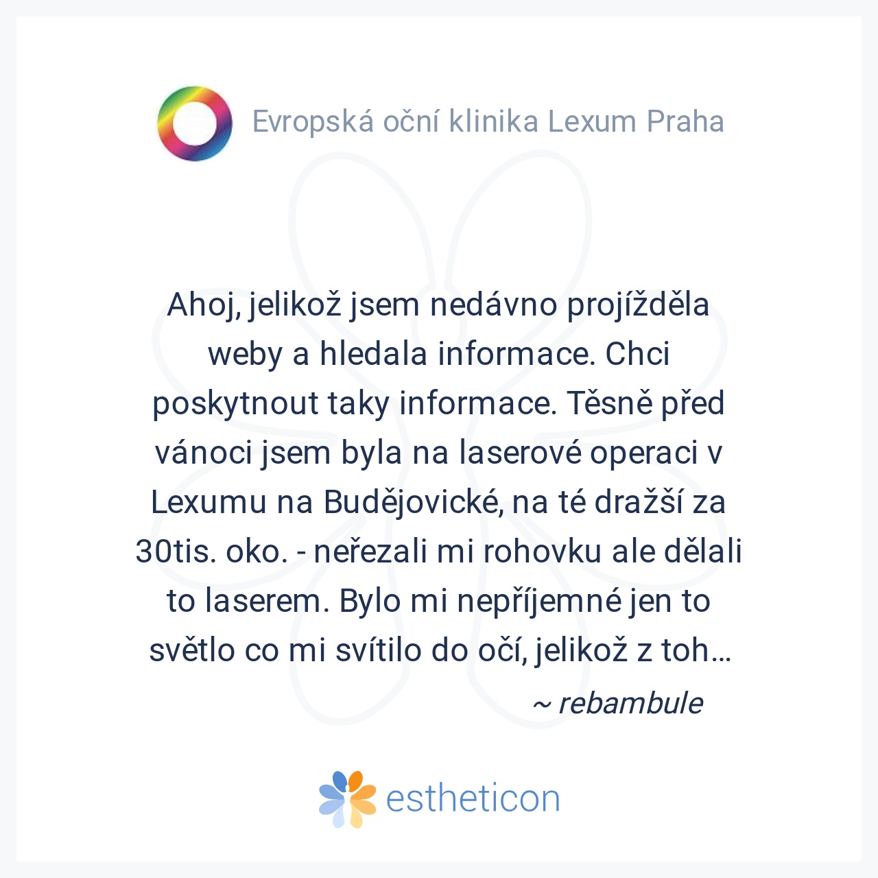 Ahoj, jelikož jsem nedávno projížděla weby a hledala informace. Chci poskytnout taky informace. Těsně před vánoci jsem byla na laserové operaci v Lexumu na Budějovické, na té dražší za 30tis. oko. - neřezali mi rohovku ale dělali to laserem. Bylo mi nepříjemné jen to světlo co mi svítilo do očí, jelikož z toho mám vždy křeče, tak jsem jim to na sále trochu zhoršovala. Vnímala jsem jak mi odklopují rohovku, pak jen menší tlak když laser ubíral dioptrie. Ten den to bylo hrozný, řezání v očích ale usnula jsem a už večer to bylo lepší. A druhej den PARÁDA. Je to něco úžasnýho, vidím skvěle od druhého dne, ani sluneční brýle jsem nemusela nosit. zakážou pak jen bazén a saunu. Jinde lidi co byli, tak je to bolelo třeba i týden či nemohli 3 týdny cvičit atak. Já fakt doporučuju po mé zkušenosti LEXUM jelikož zatím skvělý.