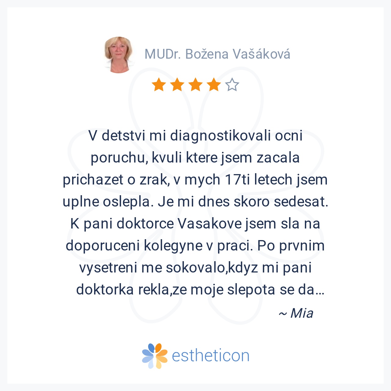 V detstvi mi diagnostikovali ocni poruchu, kvuli ktere jsem zacala prichazet o zrak, v mych 17ti letech jsem uplne oslepla. Je mi dnes skoro sedesat. K pani doktorce Vasakove jsem sla na doporuceni kolegyne v praci. Po prvnim vysetreni me sokovalo,kdyz mi pani doktorka rekla,ze moje slepota se da lecit... Poslala me na nekolik vysetreni a pak operace....JA PO 40TI LETECH VIDIM!!! poprve jsem videla sveho manzela, sve deti, vnoucata... Pani doktorka je muj andel, zmenila mi cely zivot, je jednim z nejdůležitějších lidi v mem zivote. Zadny lekar predtim nezminil ani naznakem, ze se s tim da neco delat. Doporucuju na 100%!!!