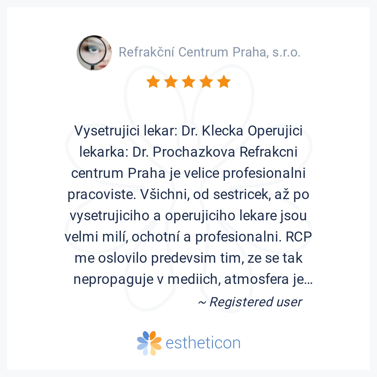 Vysetrujici lekar: Dr. Klecka Operujici lekarka: Dr. Prochazkova Refrakcni centrum Praha je velice profesionalni pracoviste. Všichni, od sestricek, až po vysetrujiciho a operujiciho lekare jsou velmi milí, ochotní a profesionalni. RCP me oslovilo predevsim tim, ze se tak nepropaguje v mediich, atmosfera je spise rodinna, ocenuji velice individualni a vstricny pristup k pacientovi. Sestricky i lekari neustale projevovali ucast a vse dopodrobna nekolikrat vysvetlovali. Operace (kratkozrakost) se zdařila na výbornou. Pooperacni pece skvela. Dekuji primari Novakovi a celemu tymu.