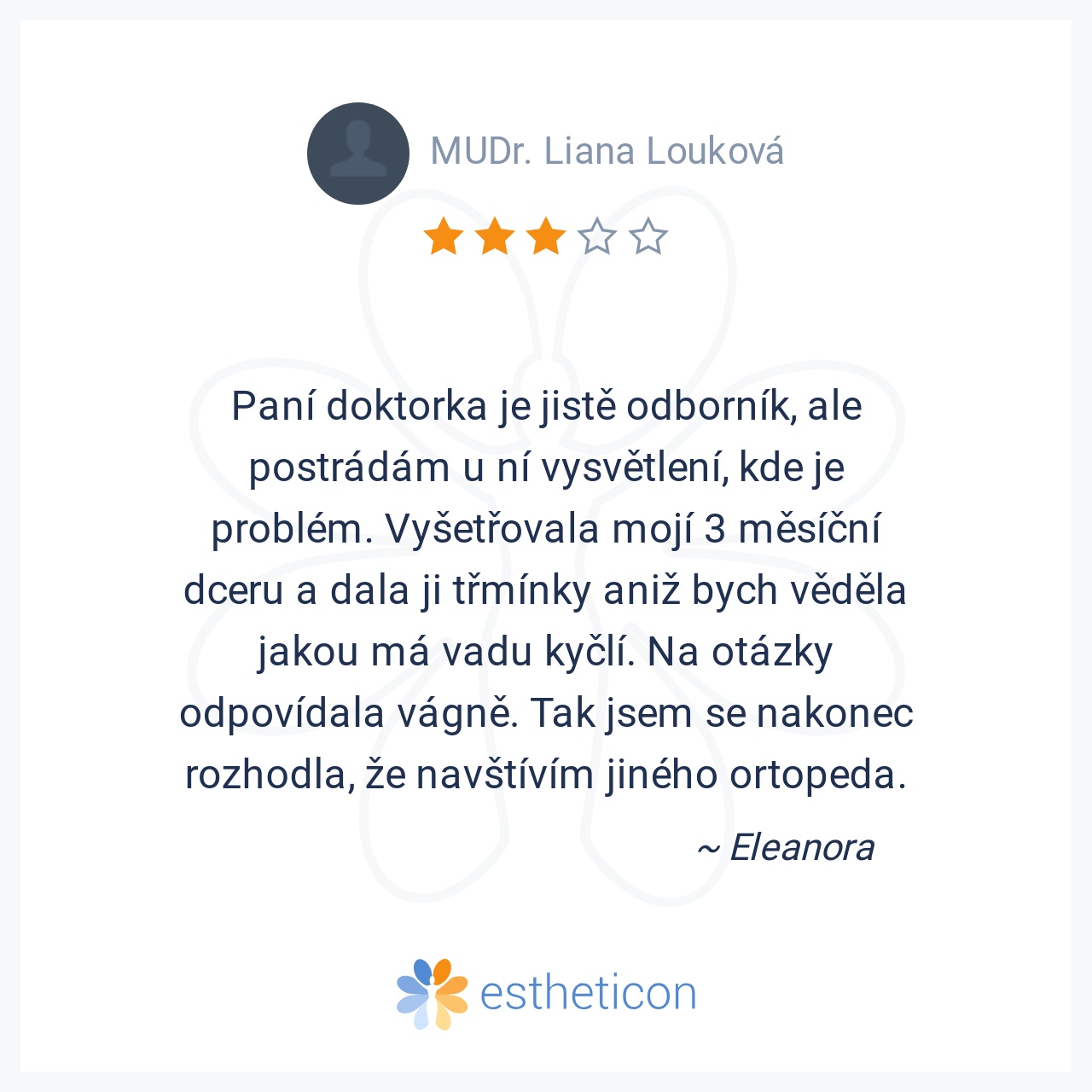 Paní doktorka je jistě odborník, ale postrádám u ní vysvětlení, kde je problém. Vyšetřovala mojí 3 měsíční dceru a dala ji třmínky aniž bych věděla jakou má vadu kyčlí. Na otázky odpovídala vágně. Tak jsem se nakonec rozhodla, že navštívím jiného ortopeda.