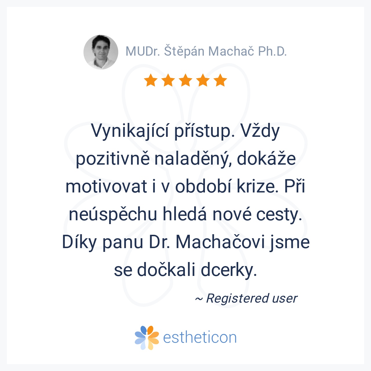 Vynikající přístup. Vždy pozitivně naladěný, dokáže motivovat i v období krize. Při neúspěchu hledá nové cesty. Díky panu Dr. Machačovi jsme se dočkali dcerky.