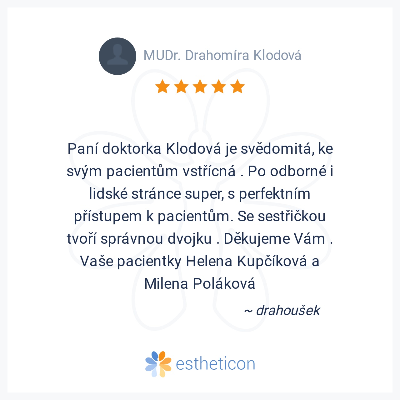 Paní doktorka Klodová je svědomitá, ke svým pacientům vstřícná . Po odborné i lidské stránce super, s perfektním přístupem k pacientům. Se sestřičkou tvoří správnou dvojku . Děkujeme Vám . Vaše pacientky Helena Kupčíková a Milena Poláková