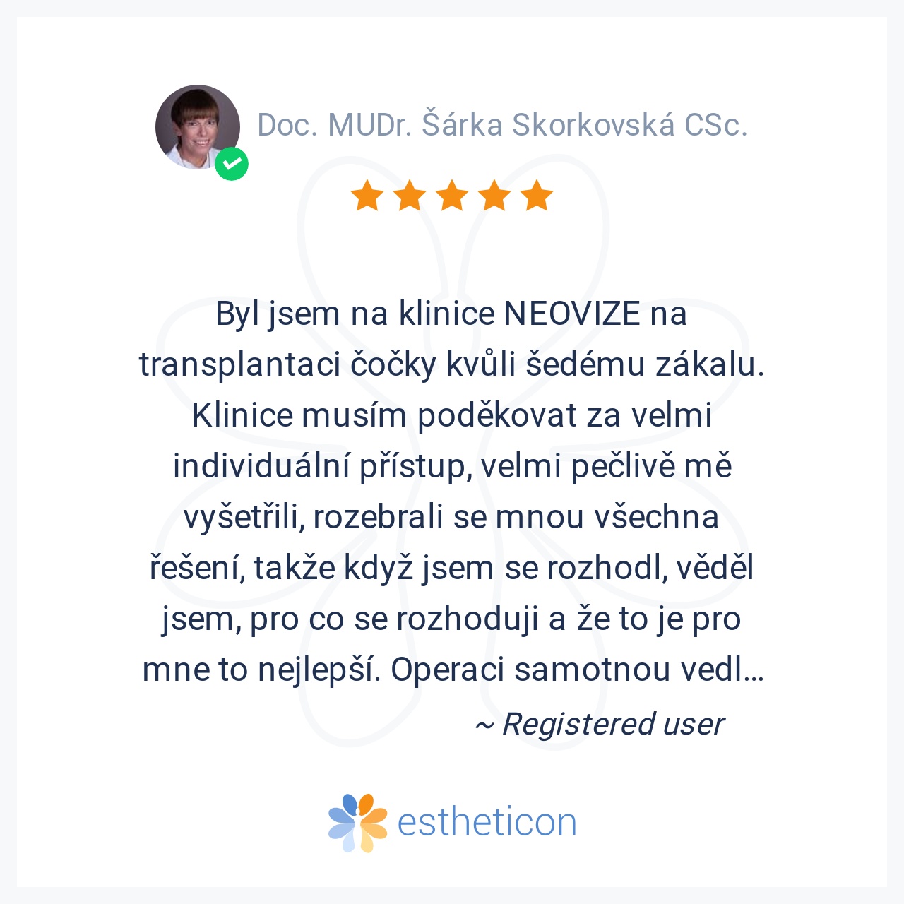 Byl jsem na klinice NEOVIZE na transplantaci čočky kvůli šedému zákalu. Klinice musím poděkovat za velmi individuální přístup, velmi pečlivě mě vyšetřili, rozebrali se mnou všechna řešení, takže když jsem se rozhodl, věděl jsem, pro co se rozhoduji a že to je pro mne to nejlepší. Operaci samotnou vedla Doc. Skorkovská a operace byla naprosto v pohodě, byla vedena zcela profesionálně a bez jakýchkoli komplikací. Moc děkuji.