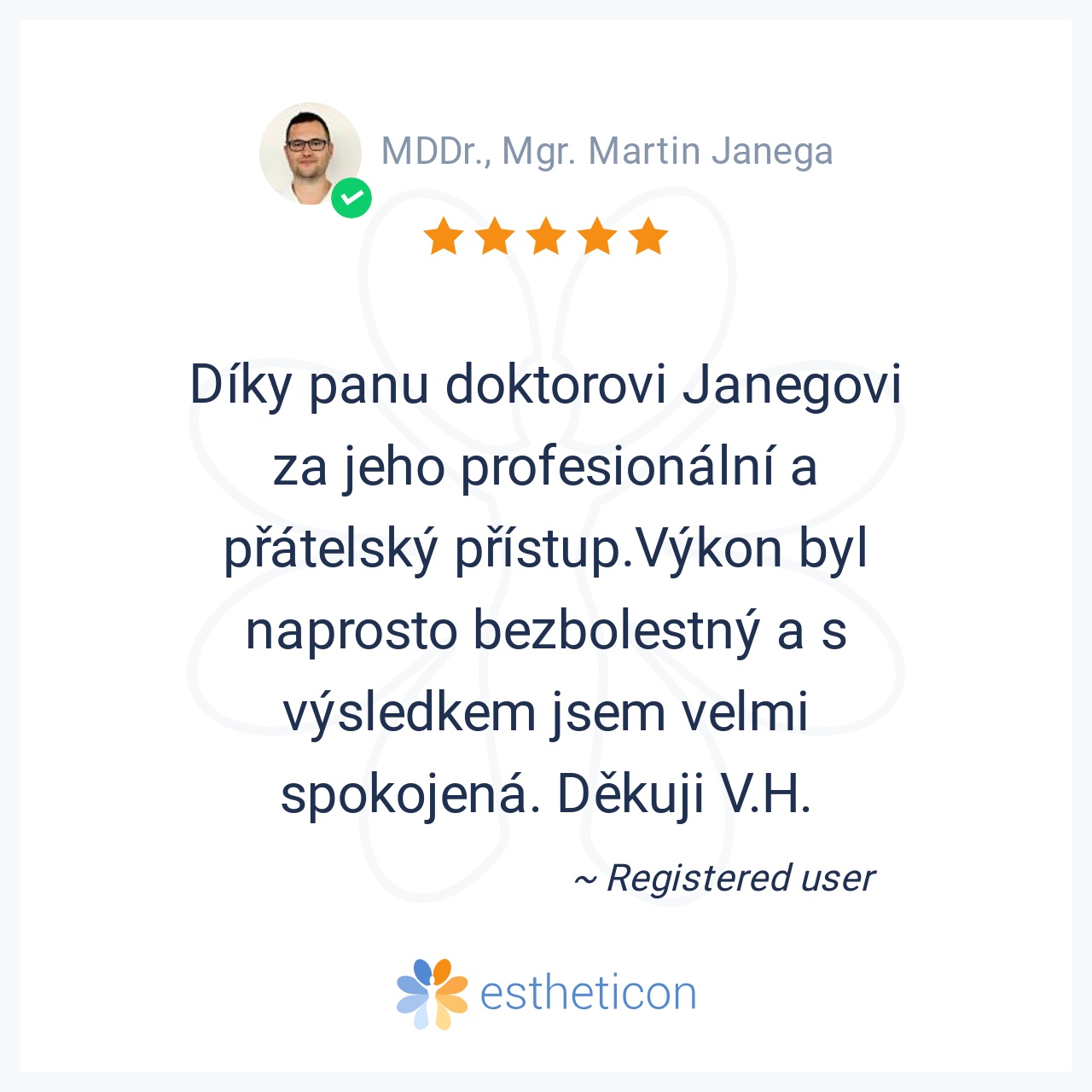 Díky panu doktorovi Janegovi za jeho profesionální a přátelský přístup.Výkon byl naprosto bezbolestný a s výsledkem jsem velmi spokojená. Děkuji V.H.