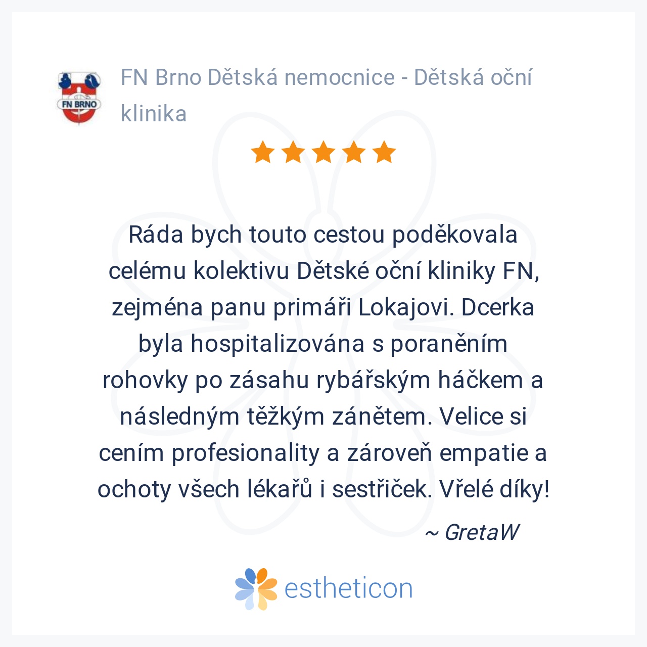 Ráda bych touto cestou poděkovala celému kolektivu Dětské oční kliniky FN, zejména panu primáři Lokajovi. Dcerka byla hospitalizována s poraněním rohovky po zásahu rybářským háčkem a následným těžkým zánětem. Velice si cením profesionality a zároveň empatie a ochoty všech lékařů i sestřiček. Vřelé díky!